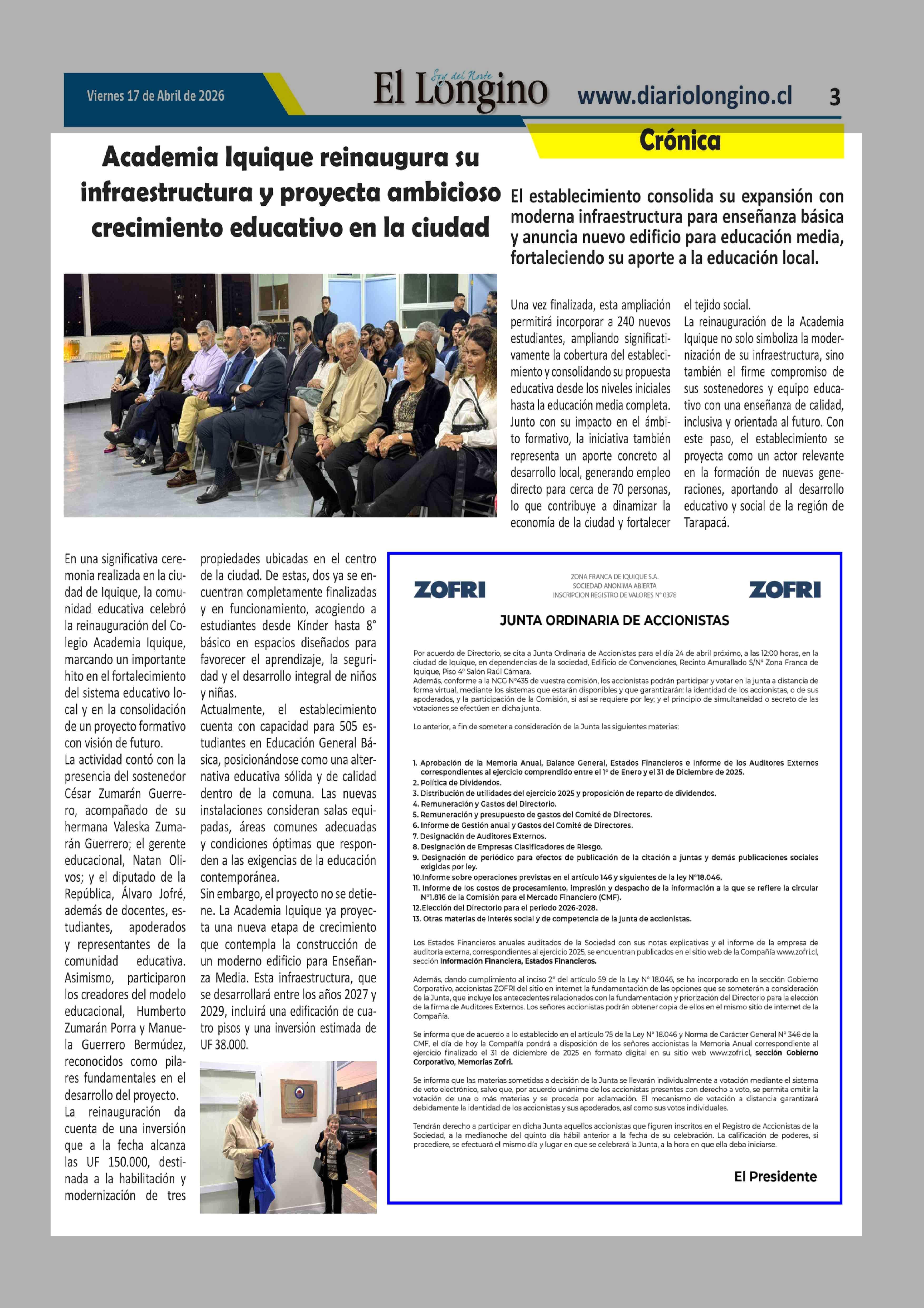 Academia Iquique reinaugura su infraestructura y proyecta ambicioso crecimiento educativo en la ciudad 17-04-2026 El Longino |