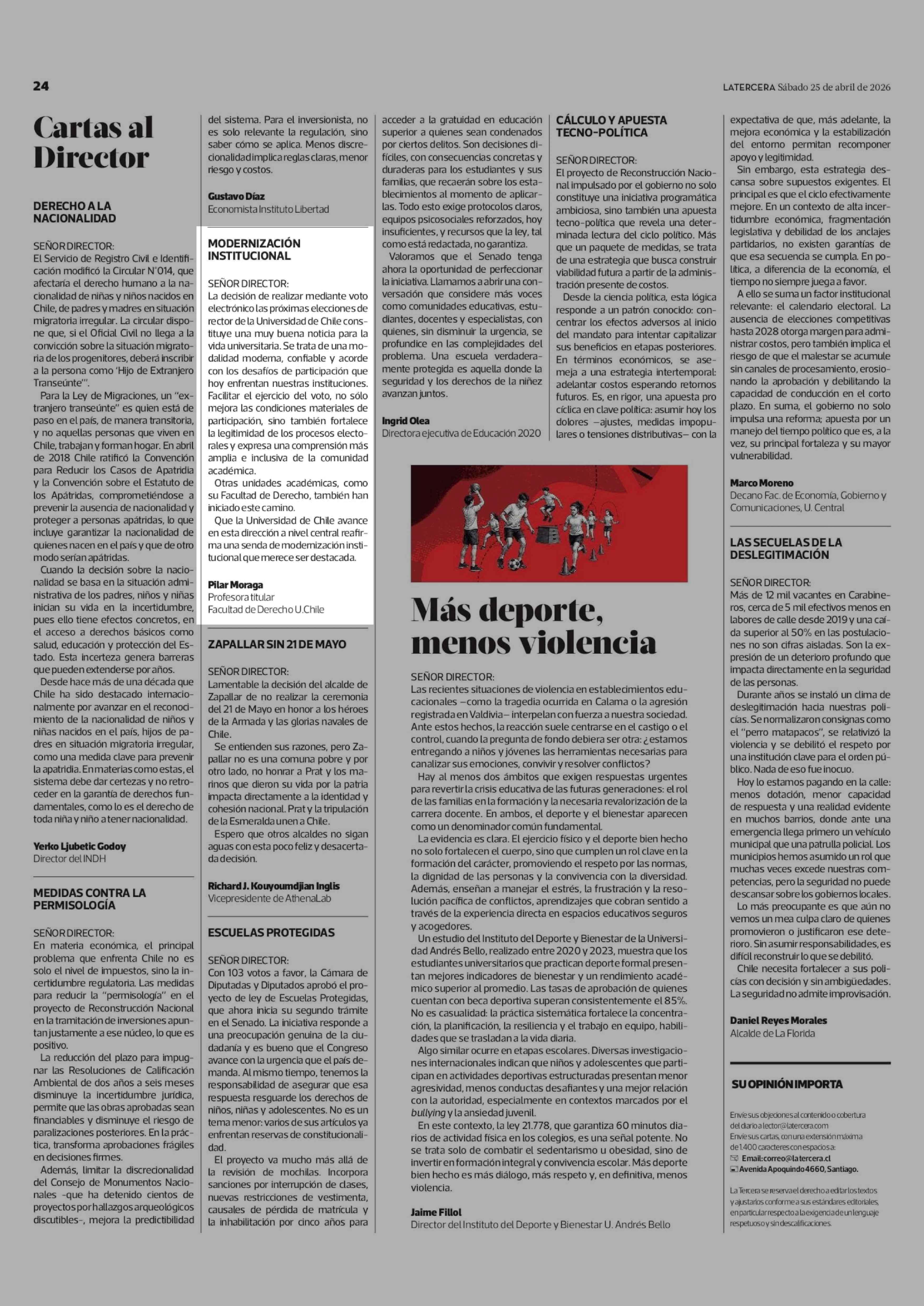 Cartas: MODERNIZACIÓN INSTITUCIONAL 25-04-2026 La Tercera |