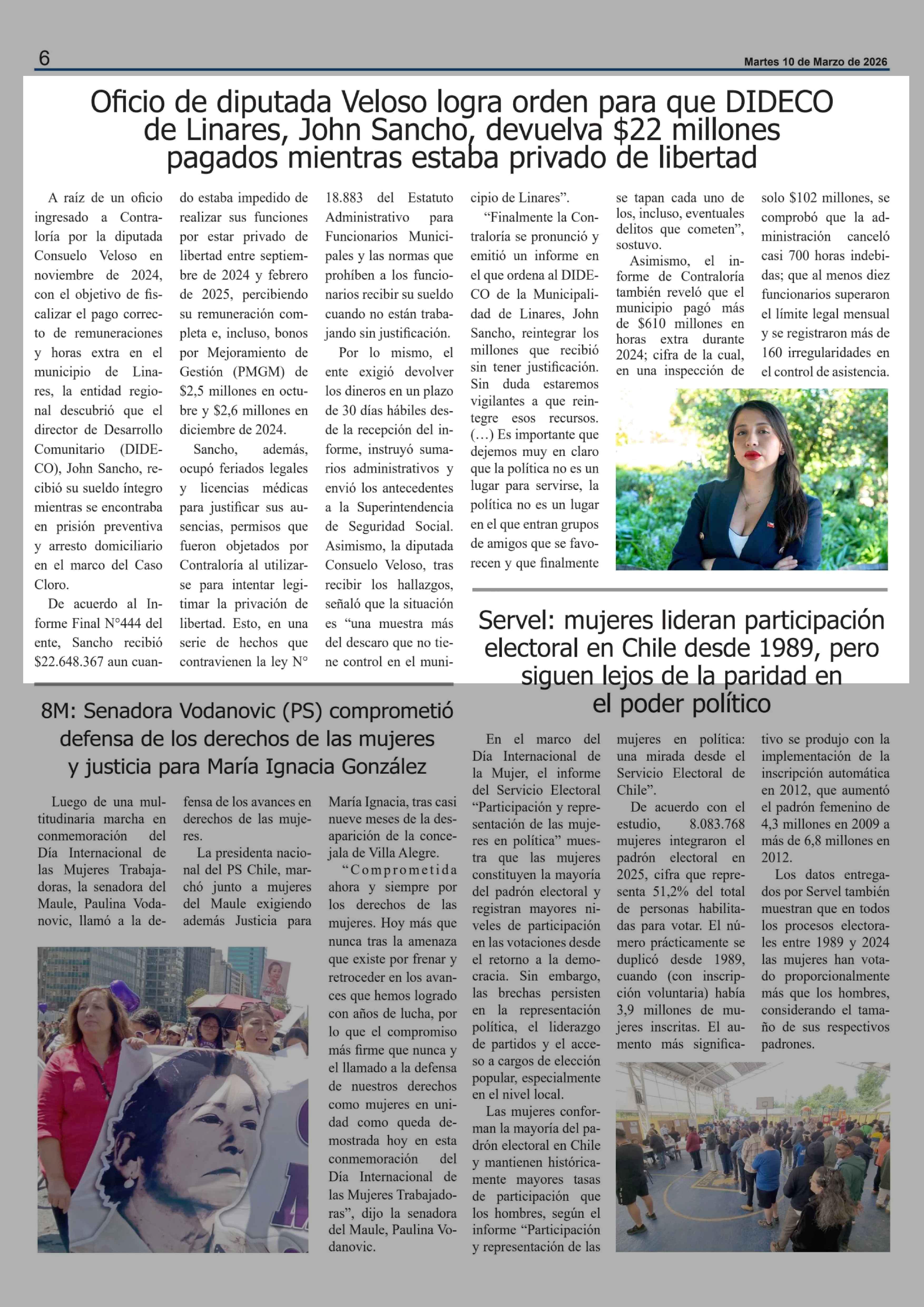 Oficio de diputada Veloso logra orden para que DIDECO de Linares, John Sancho, devuelva $22 millones pagados mientras estaba privado de libertad 10-03-2026 El Heraldo |