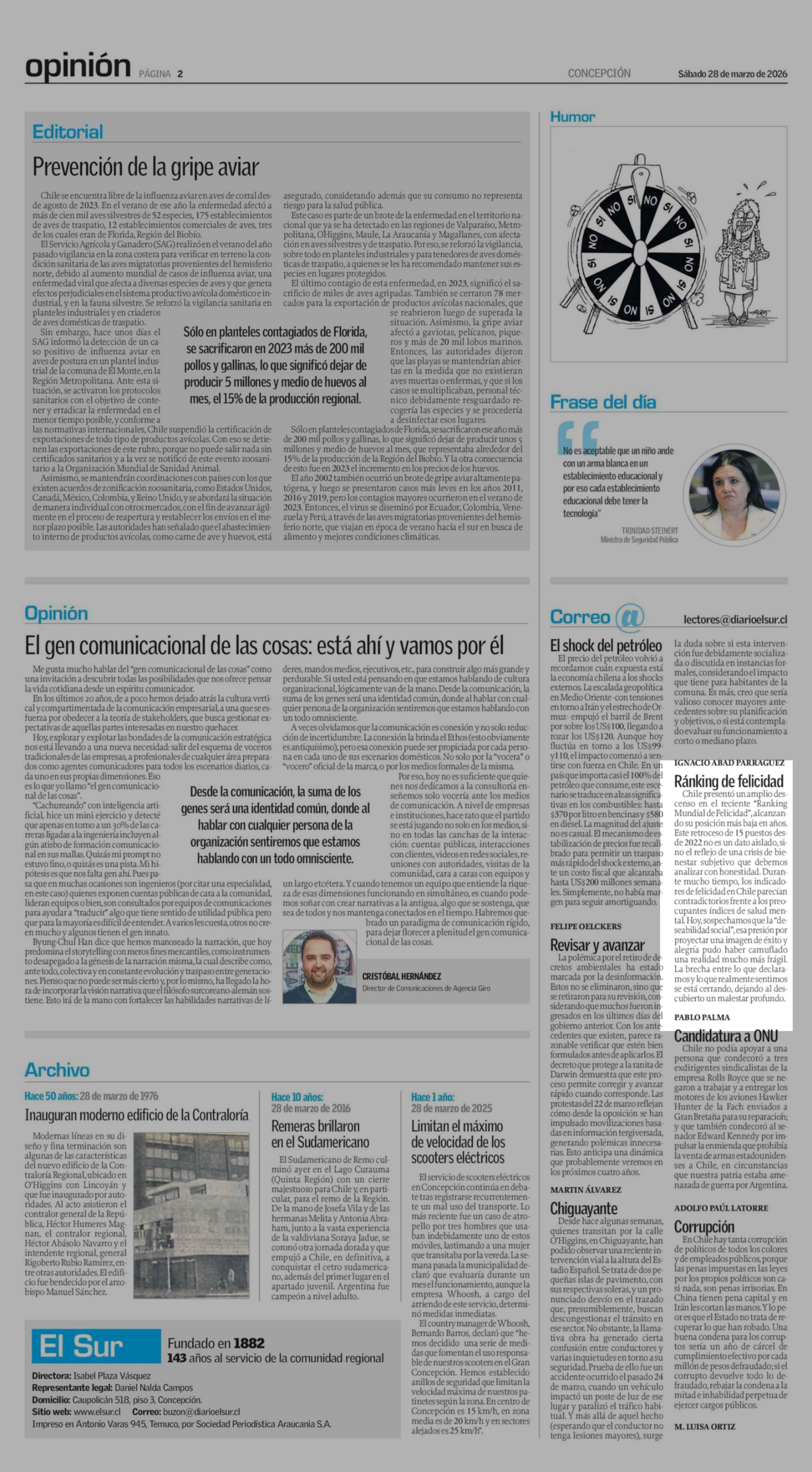 Cartas: Ránking de felicidad 28-03-2026 El Sur |