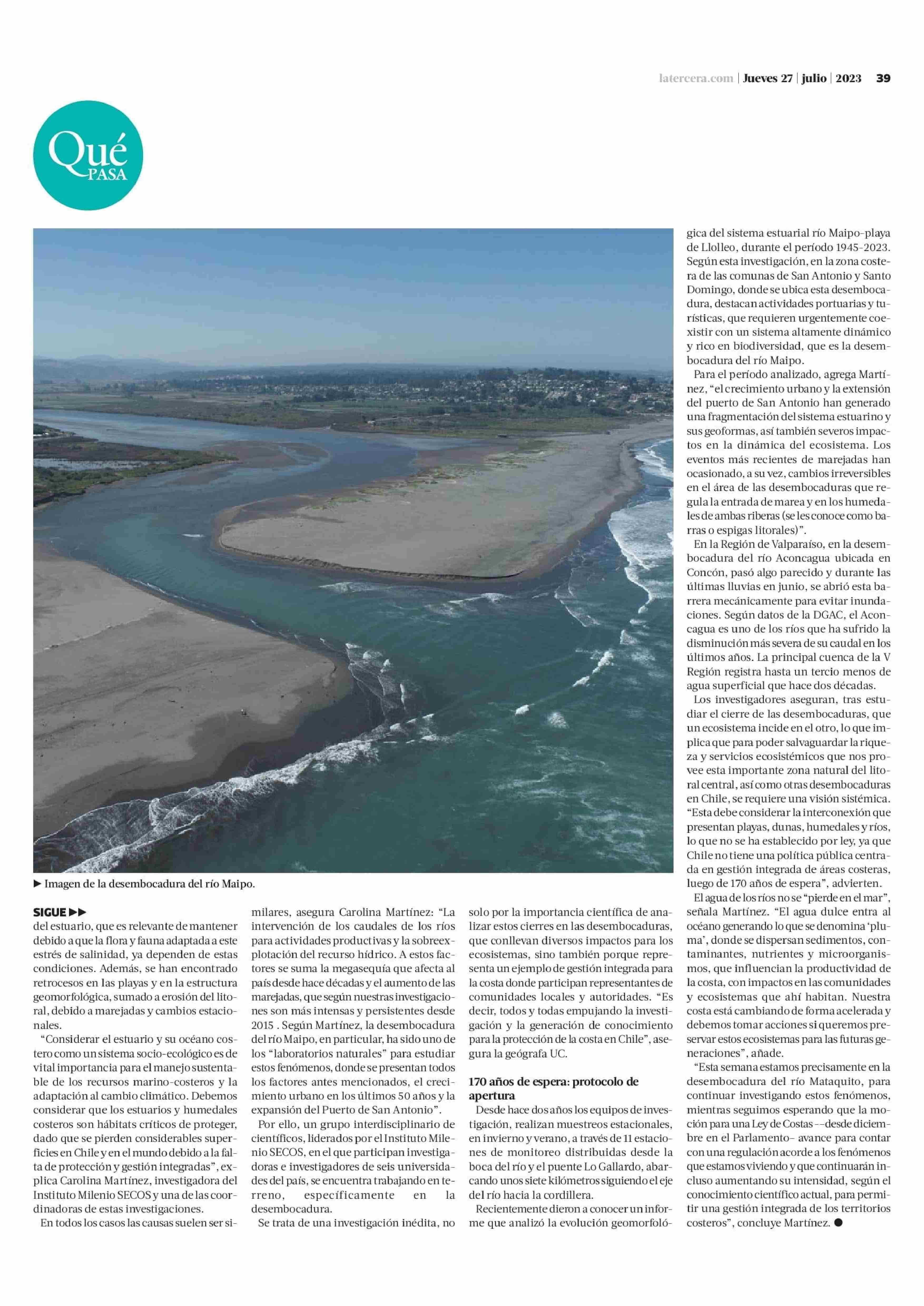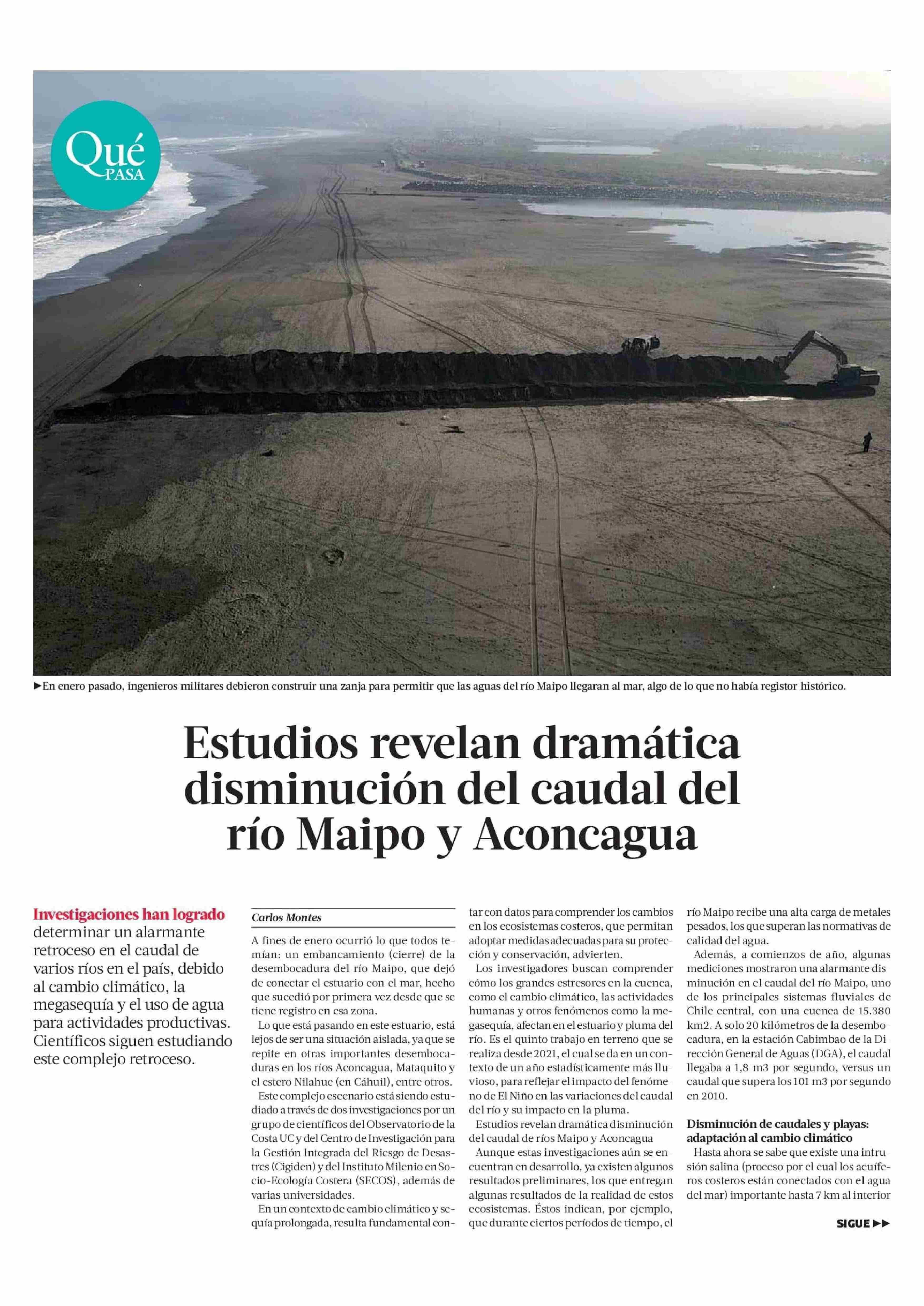 Estudios revelan dramática disminución del caudal del río Maipo y Aconcagua 27-07-2023 La Tercera |