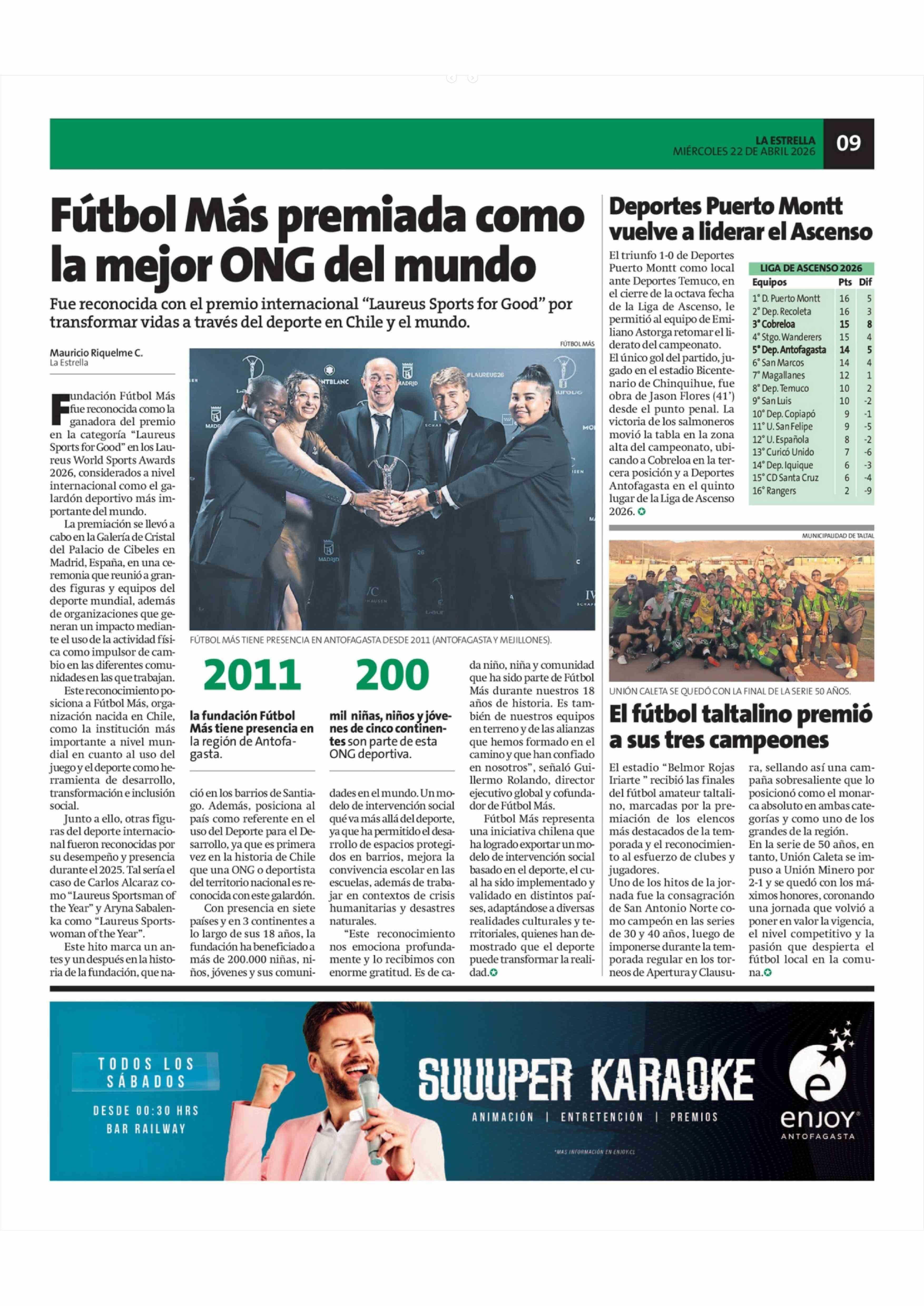 Fútbol Más premiada como la mejor ONG del mundo 22-04-2026 La Estrella de Antofagasta |