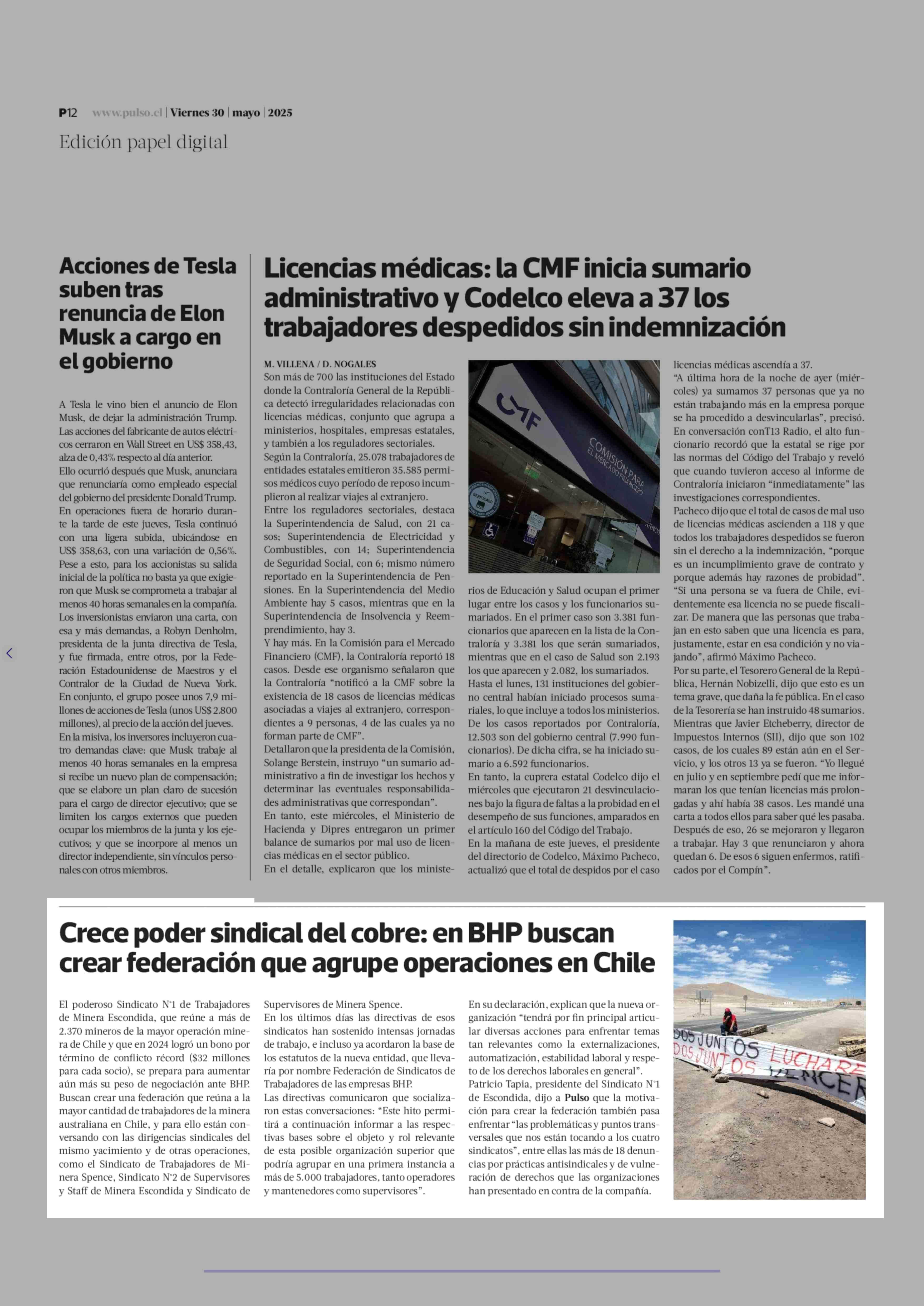 Crece poder sindical del cobre: en BHP buscan crear federación que agrupe operaciones en Chile 30-05-2025 La Tercera |