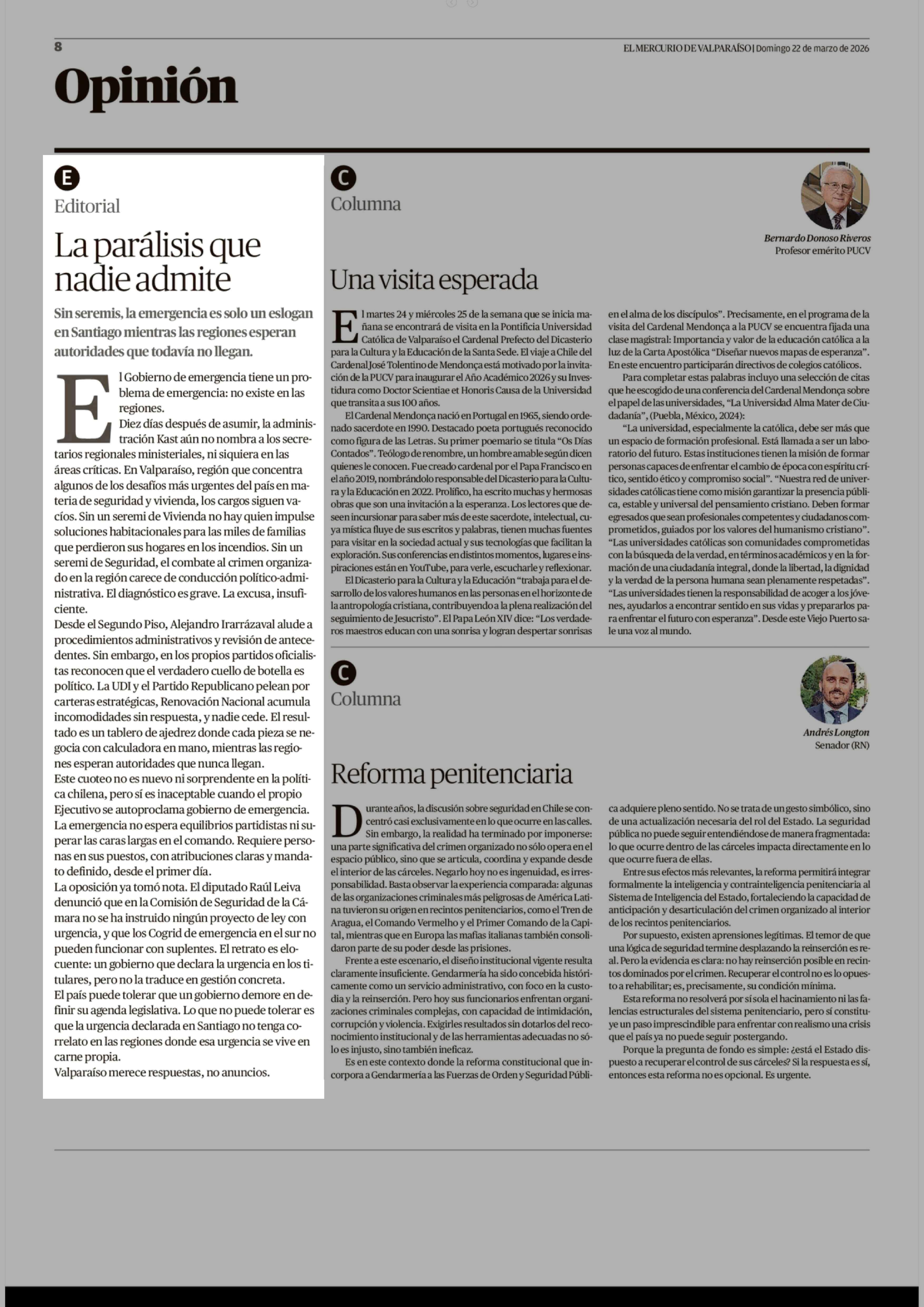 Editorial: La parálisis que nadie admite 22-03-2026 El Mercurio de Valparaíso |
