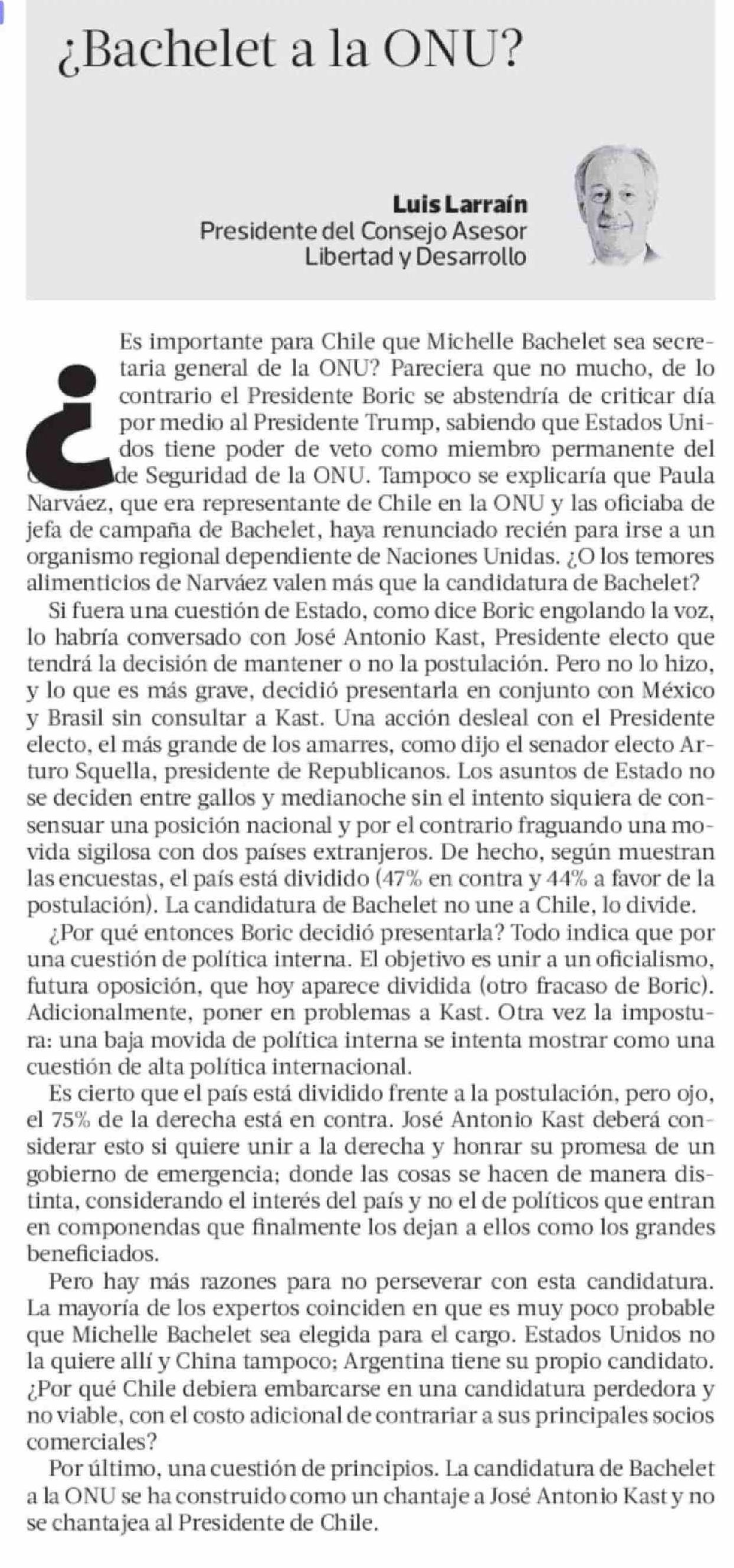Título: Columnas de Opinión: ¿Bachelet a la ONU?