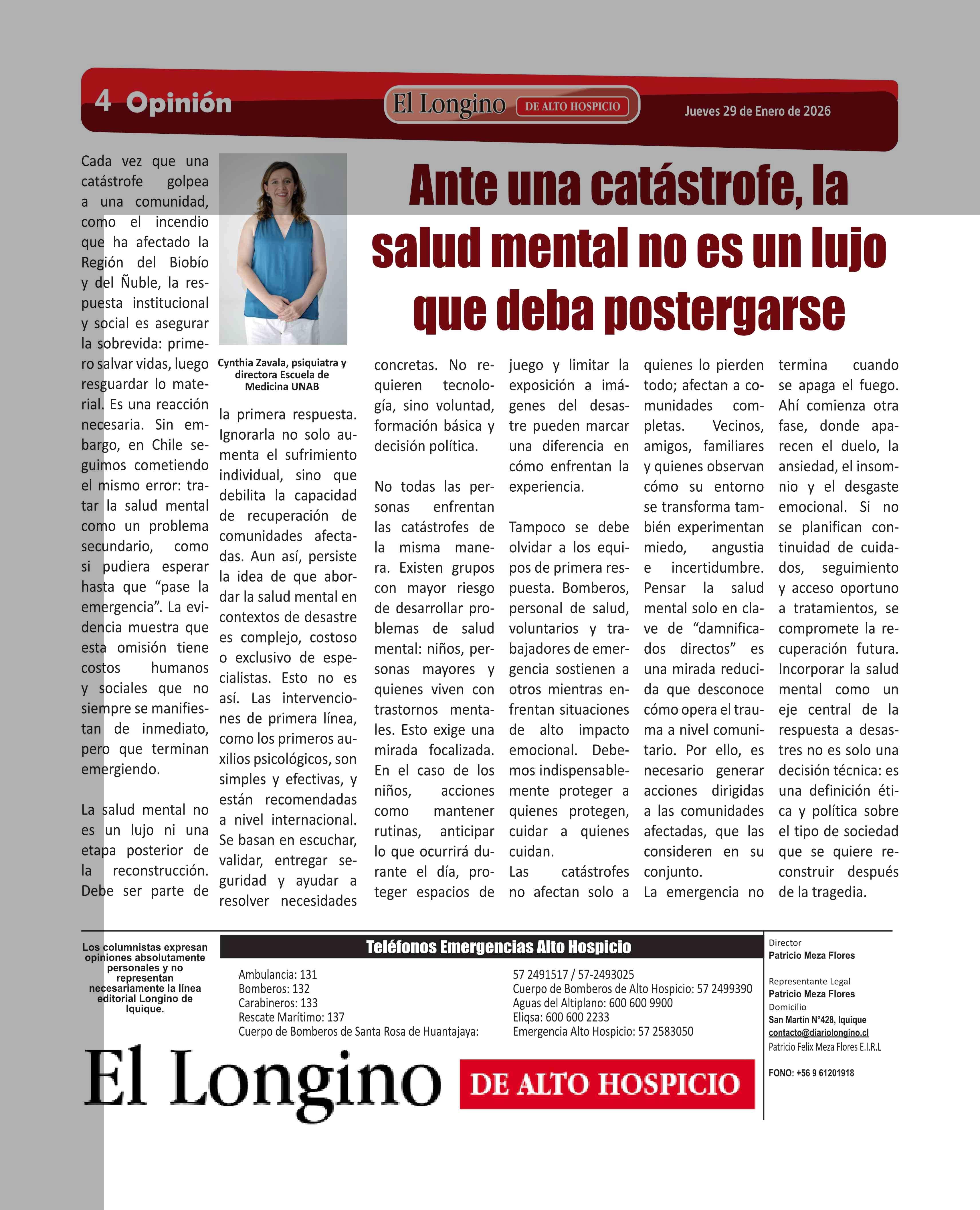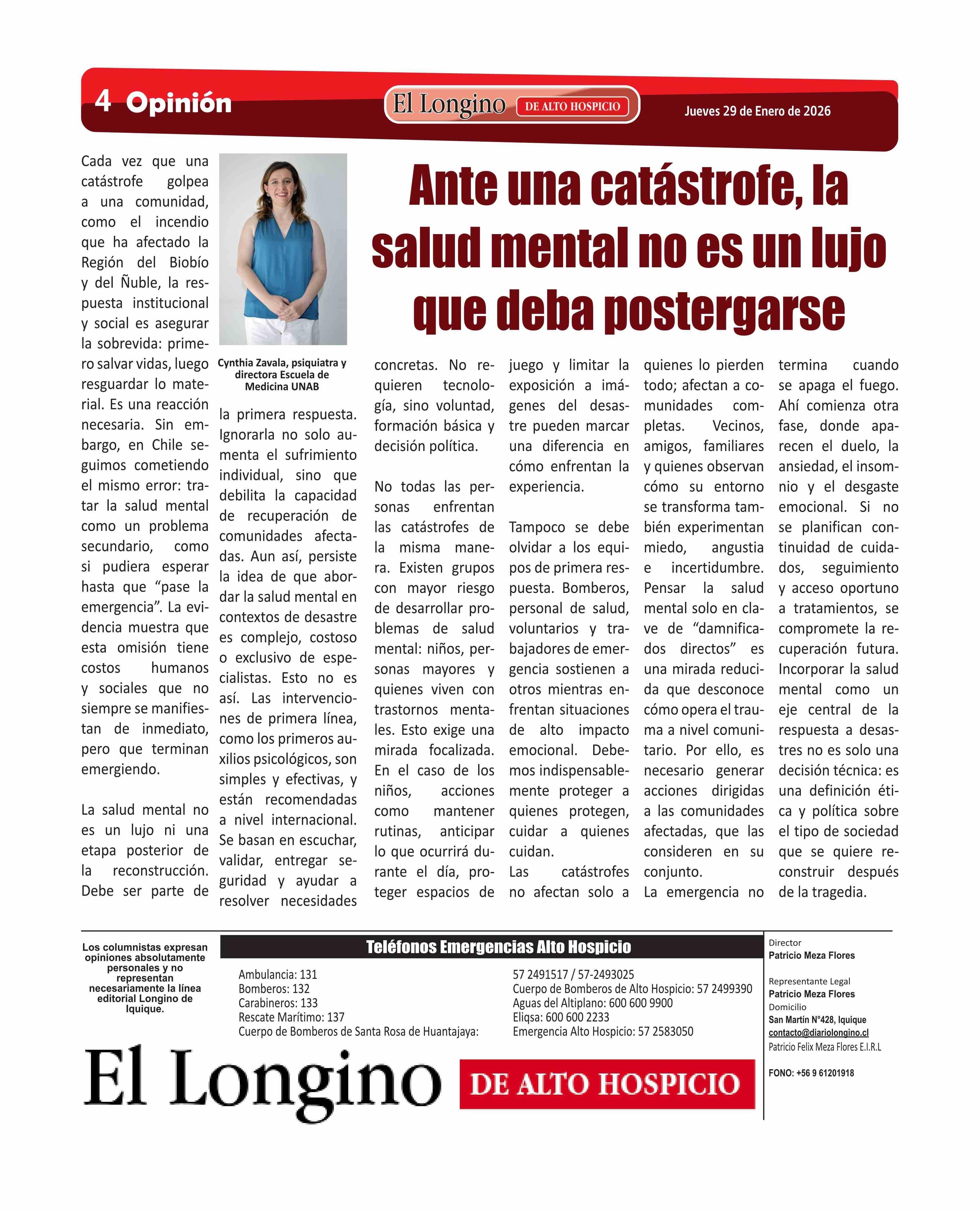 Columnas de Opinión: Ante una catástrofe, la salud mental no es un lujo que deba postergarse 29-01-2026 El Longino |
