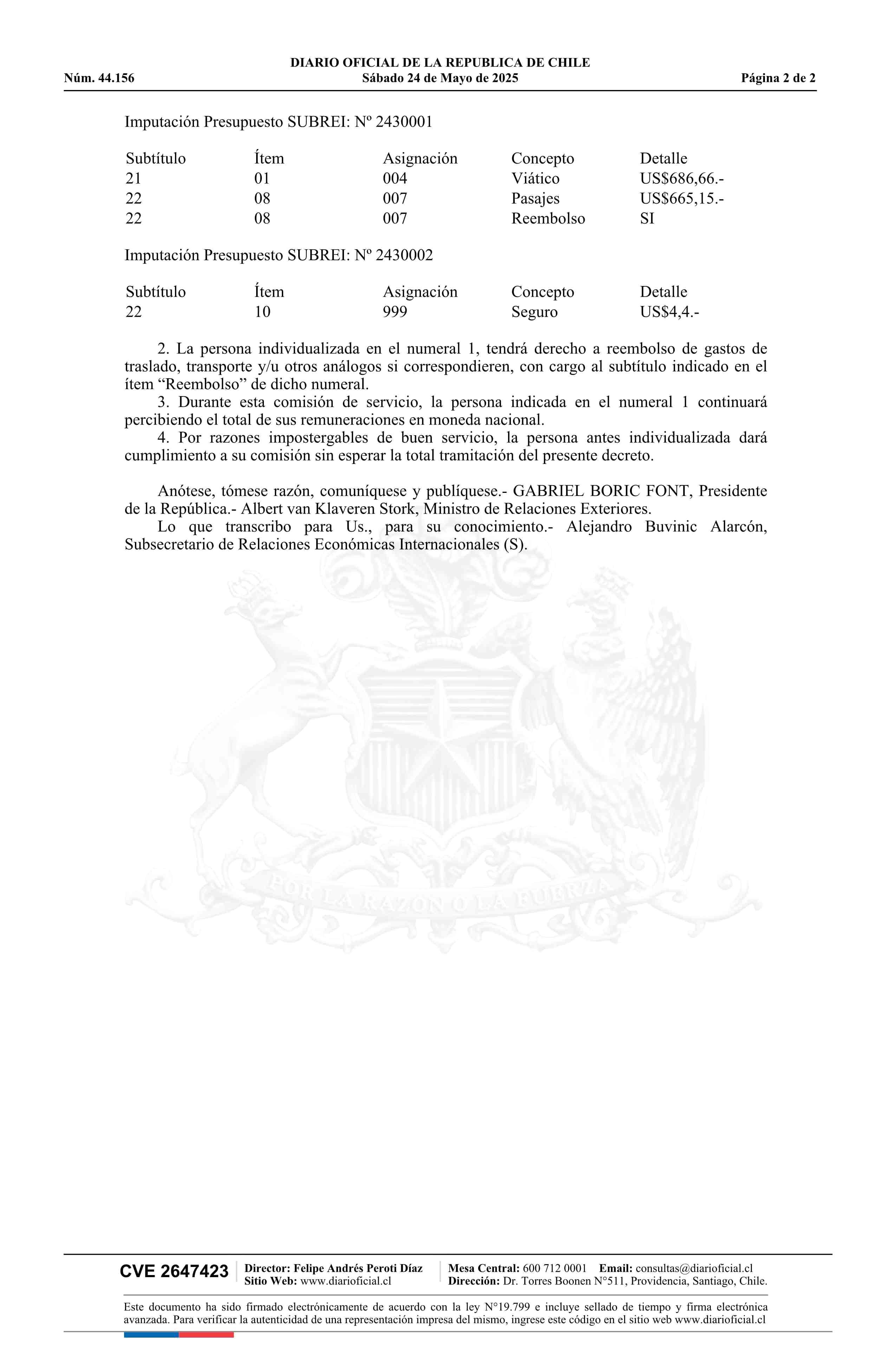 Decreto número 219, de 2024.- Comisiona a doña Claudia Sanhueza Riveros, Subsecretaria de Relaciones Económicas Internacionales, a la ciudad de Montevideo, Uruguay 24-05-2025 Diario Oficial Edición Electrónica |