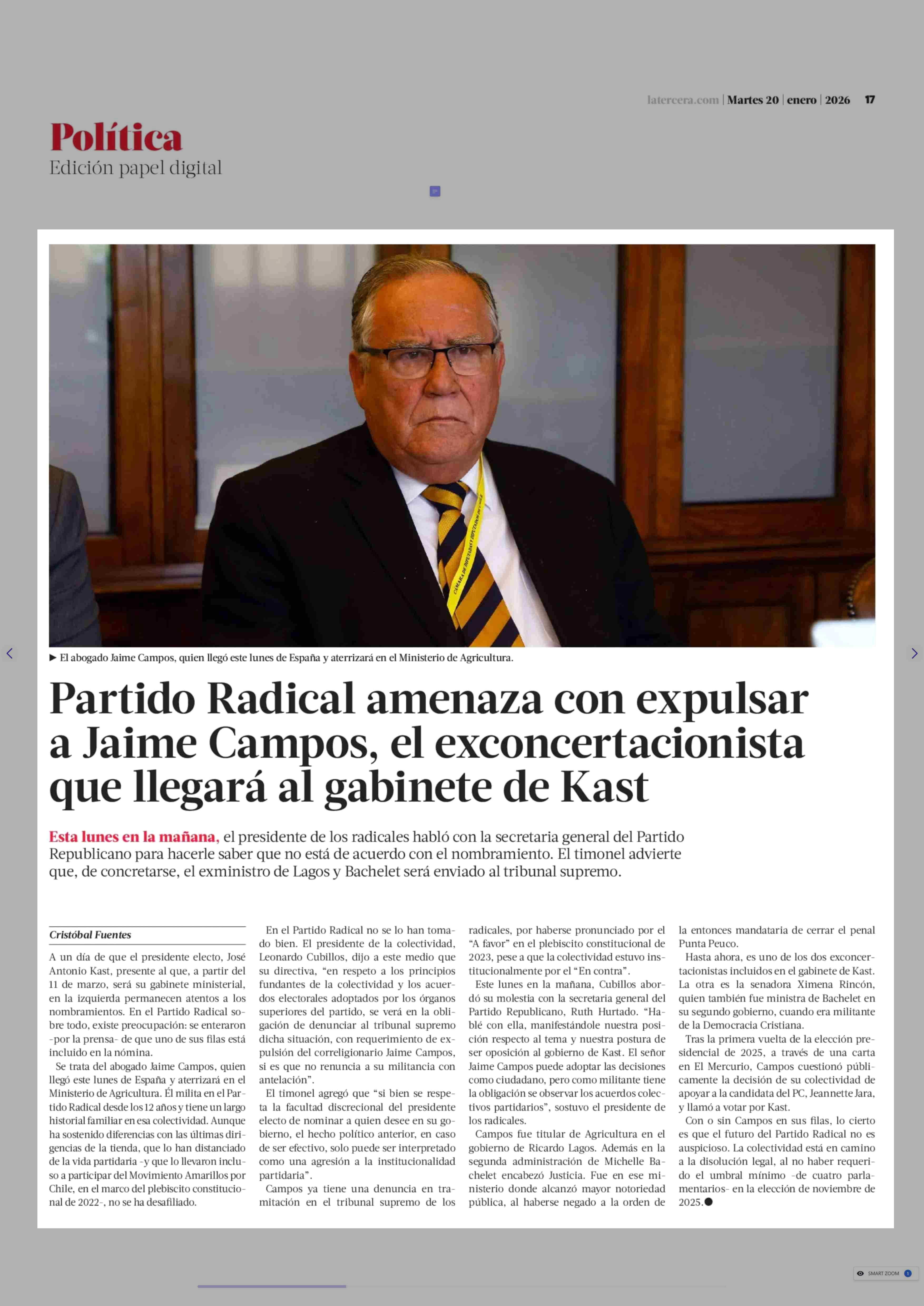 Título: Partido Radical amenaza con expulsar a Jaime Campos, el exconcertacionista que llegará al gabinete de Kast