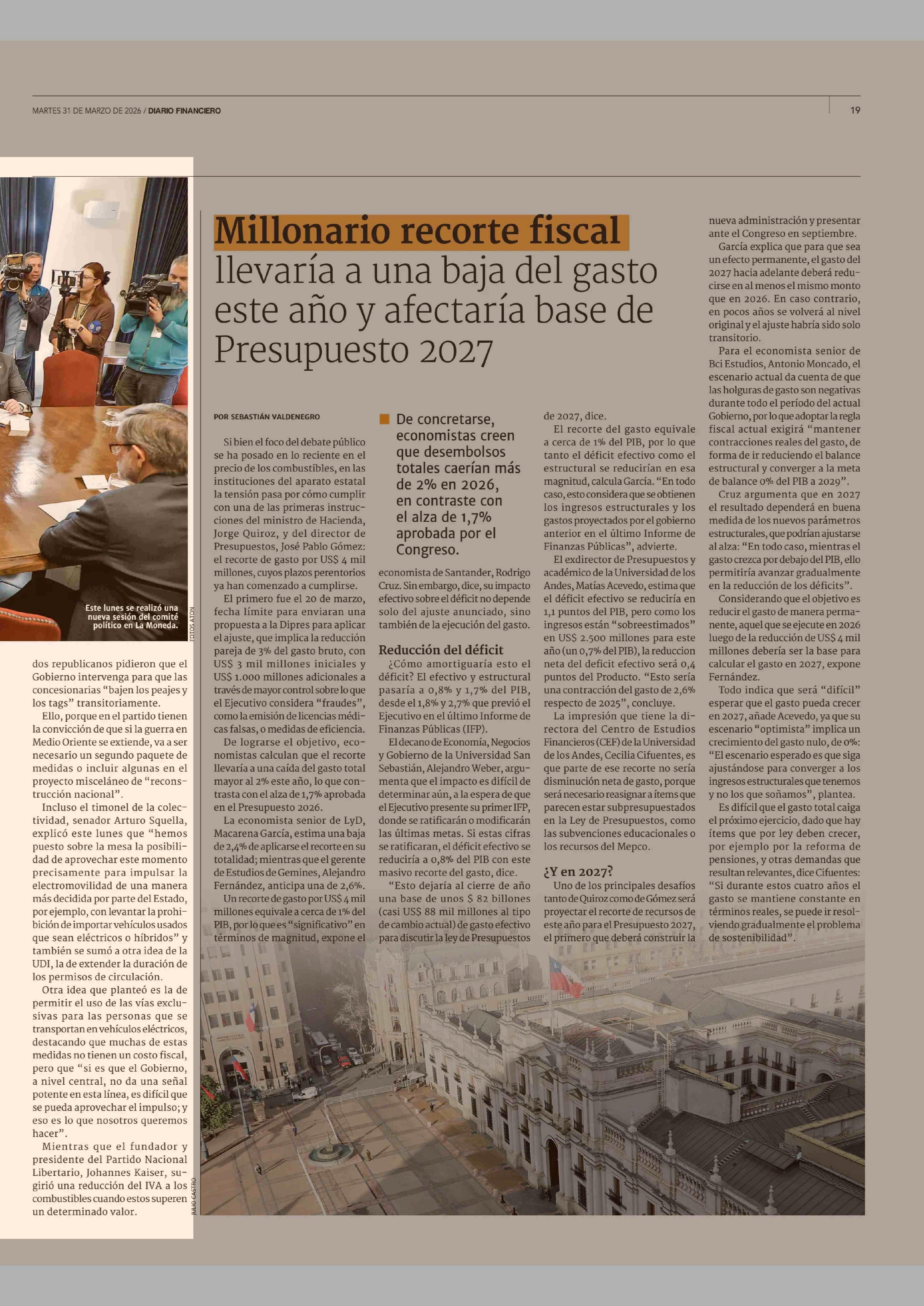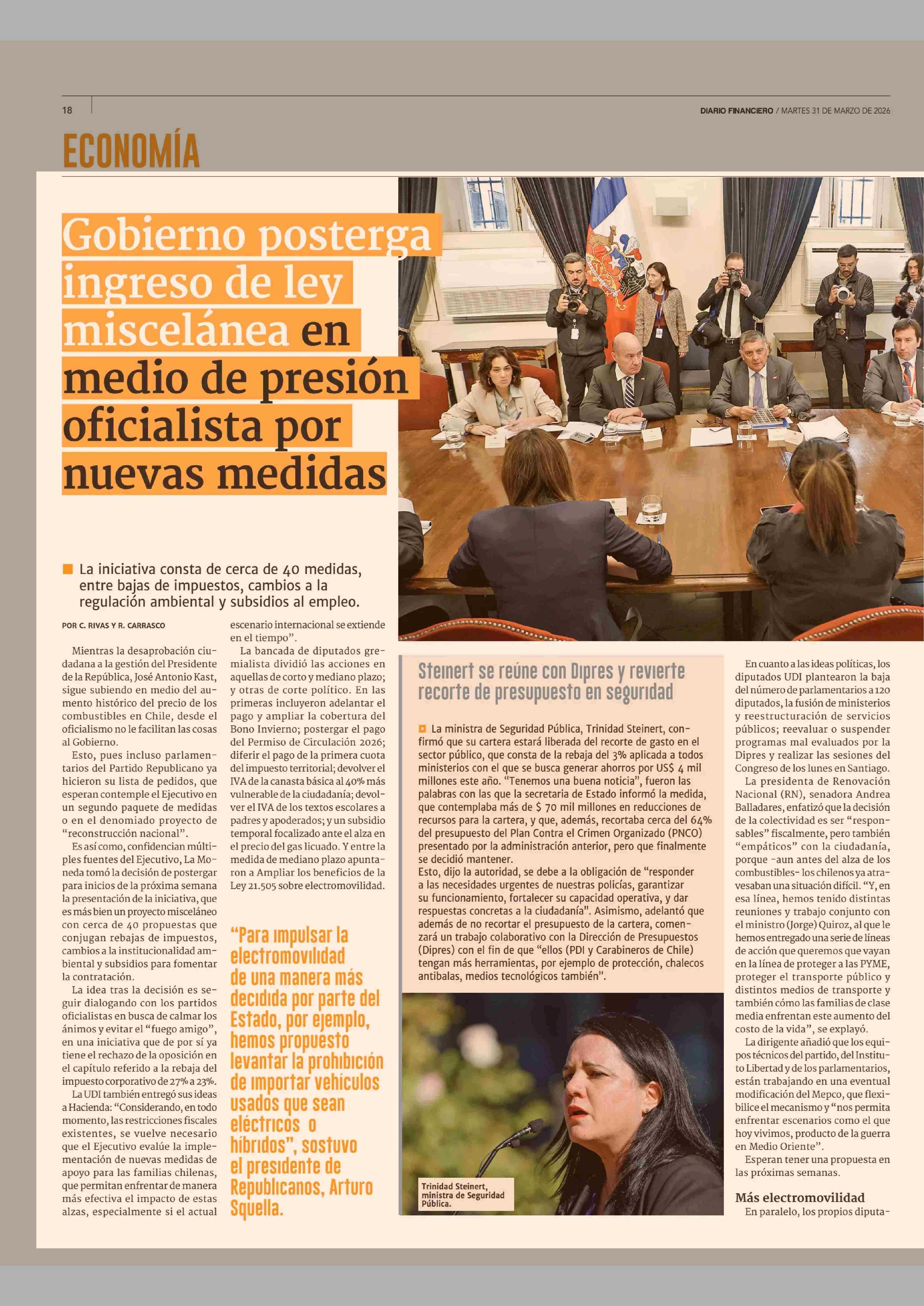 Gobierno posterga ingreso de ley miscelánea en medio de presión oficialista por nuevaas medidas 31-03-2026 Diario Financiero |