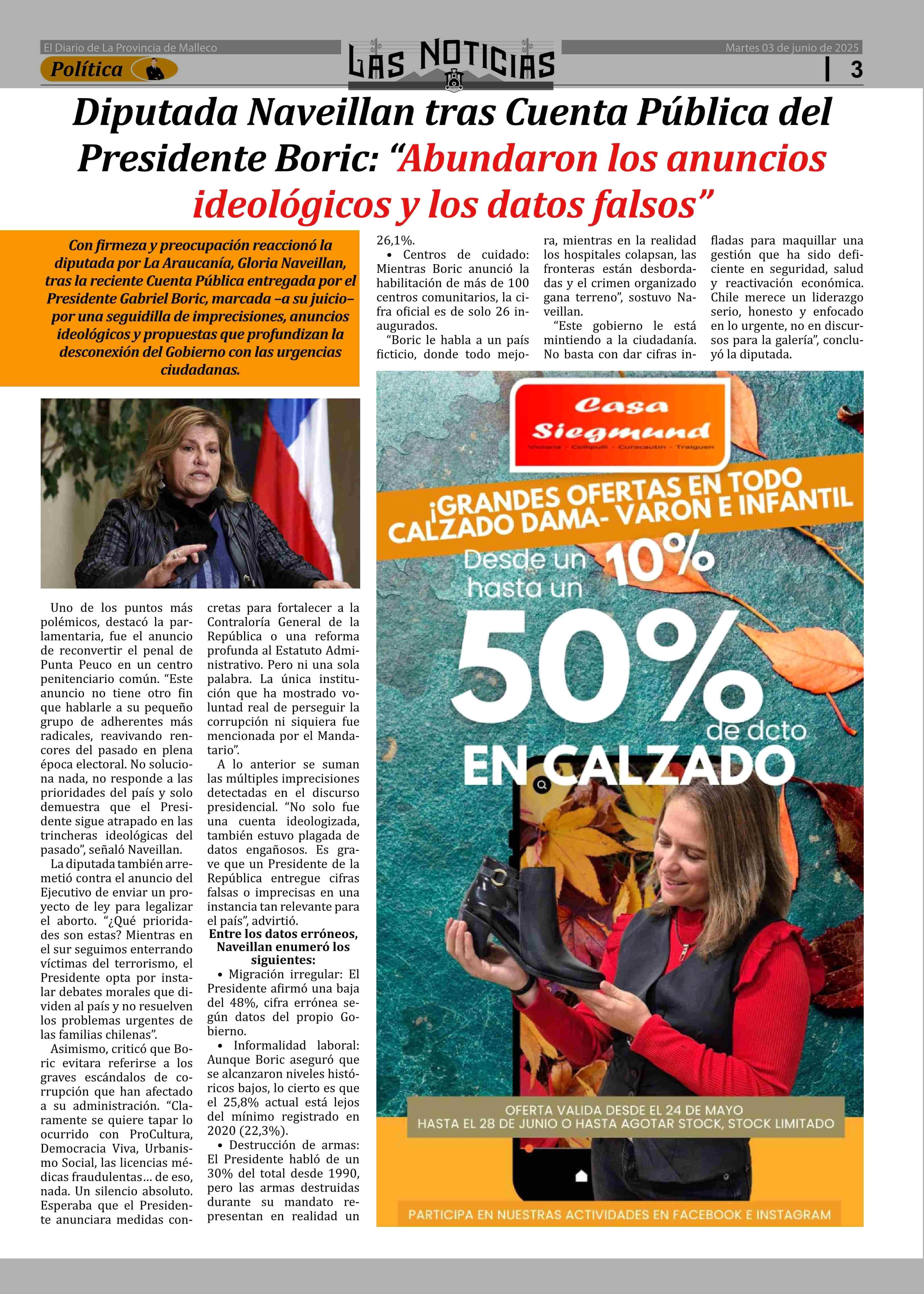 Diputada Naveillan tras Cuenta Pública del Presidente Boric: “Abundaron los anuncios ideológicos y los datos falsos” 03-06-2025 Las Noticias |