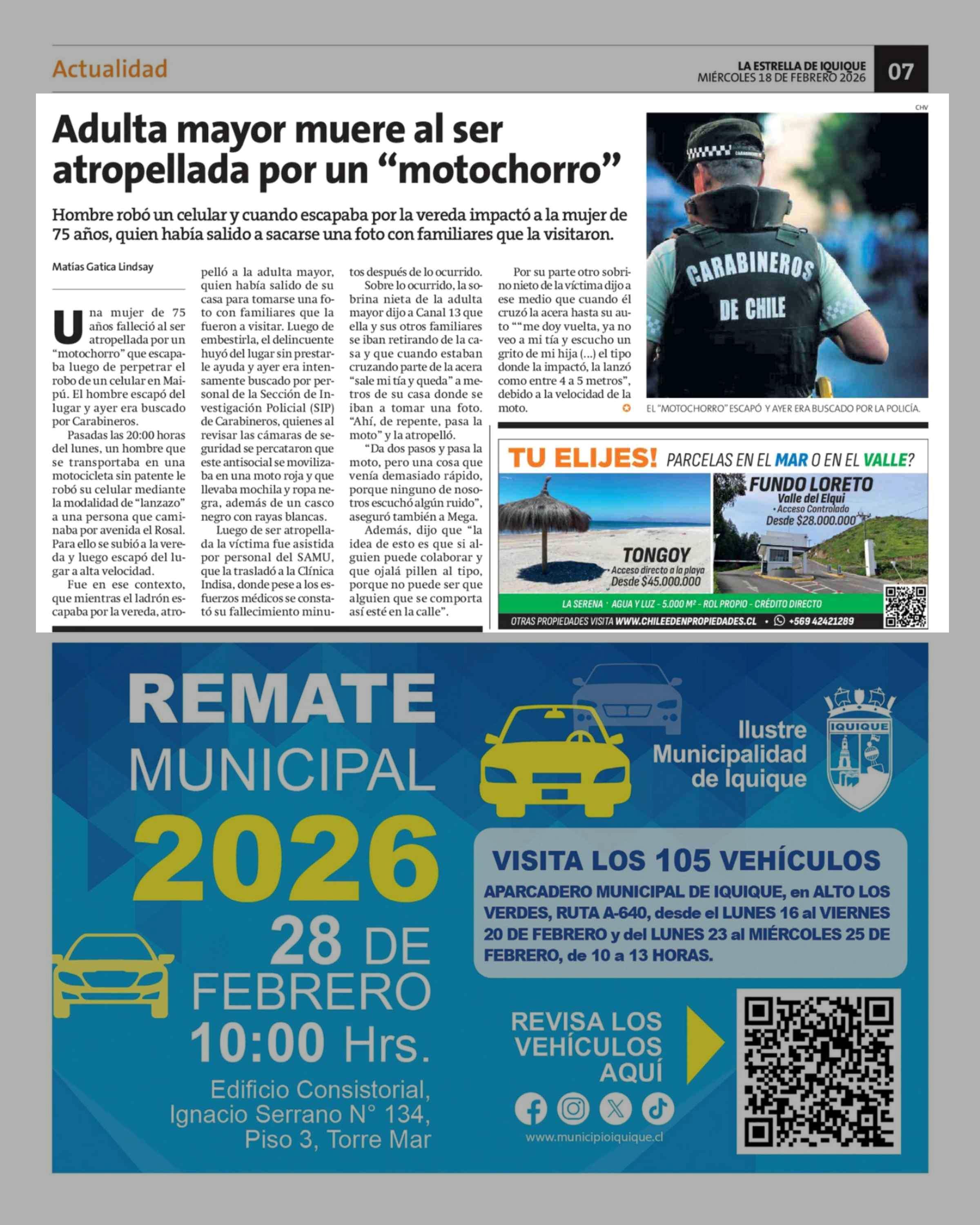 Adulta mayor muere al ser atropellada por un "motochorro" 18-02-2026 La Estrella de Iquique |