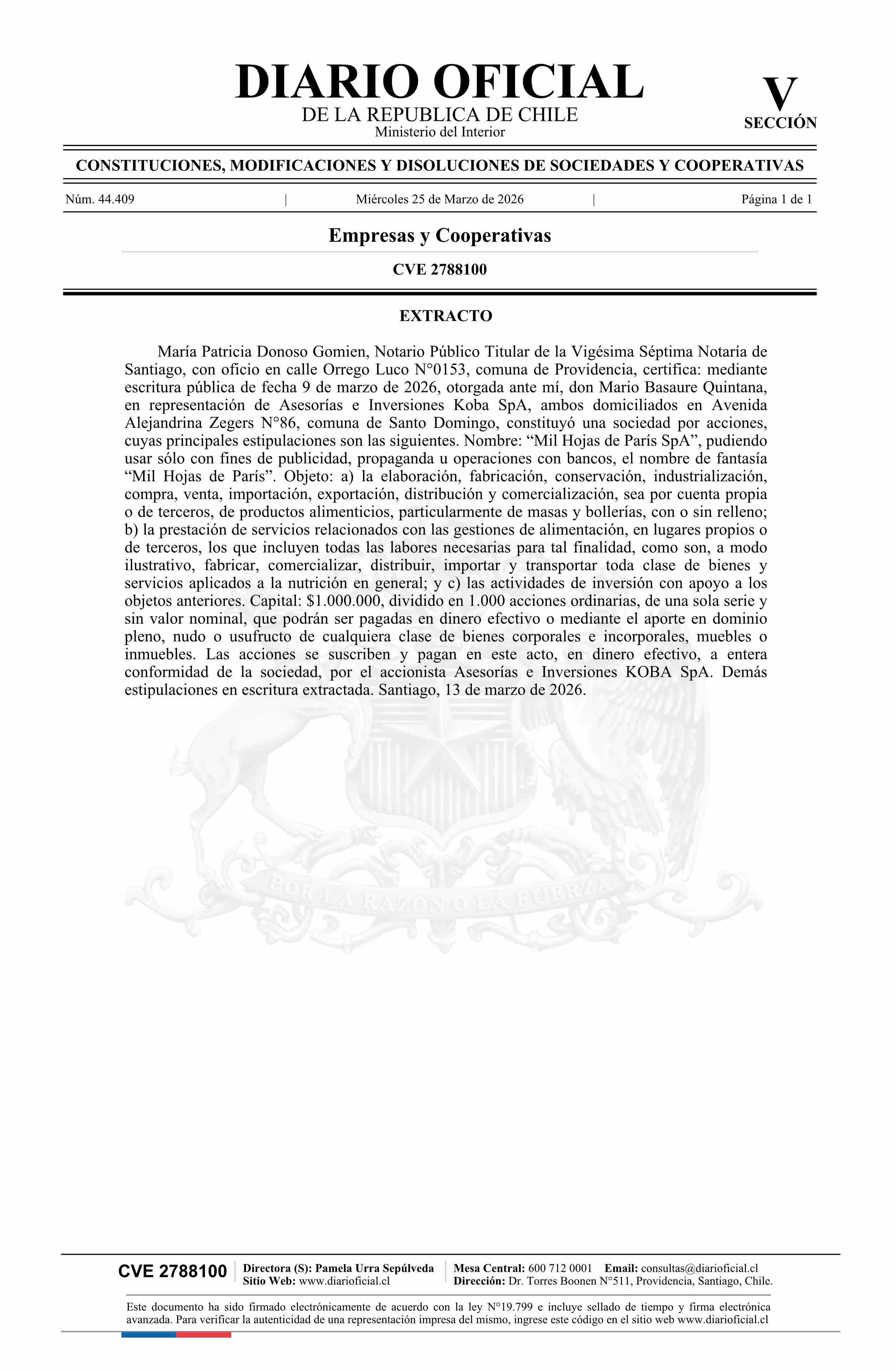 Mil Hojas de París SpA 25-03-2026 Diario Oficial Edición Electrónica |