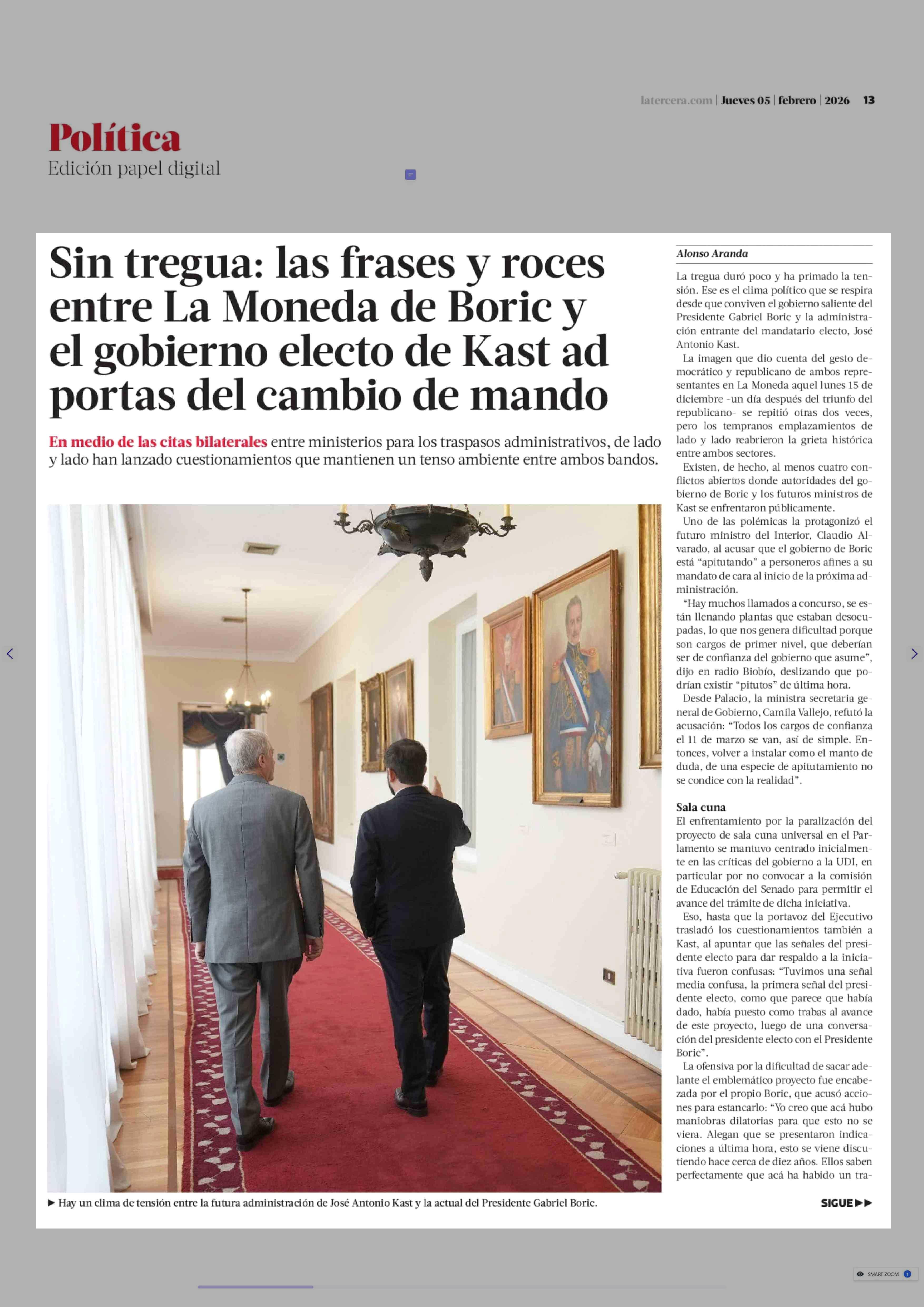Título: Sin tregua: las frases y roces entre La Moneda de Boric y el gobierno electo de Kast ad portas del cambio de mando