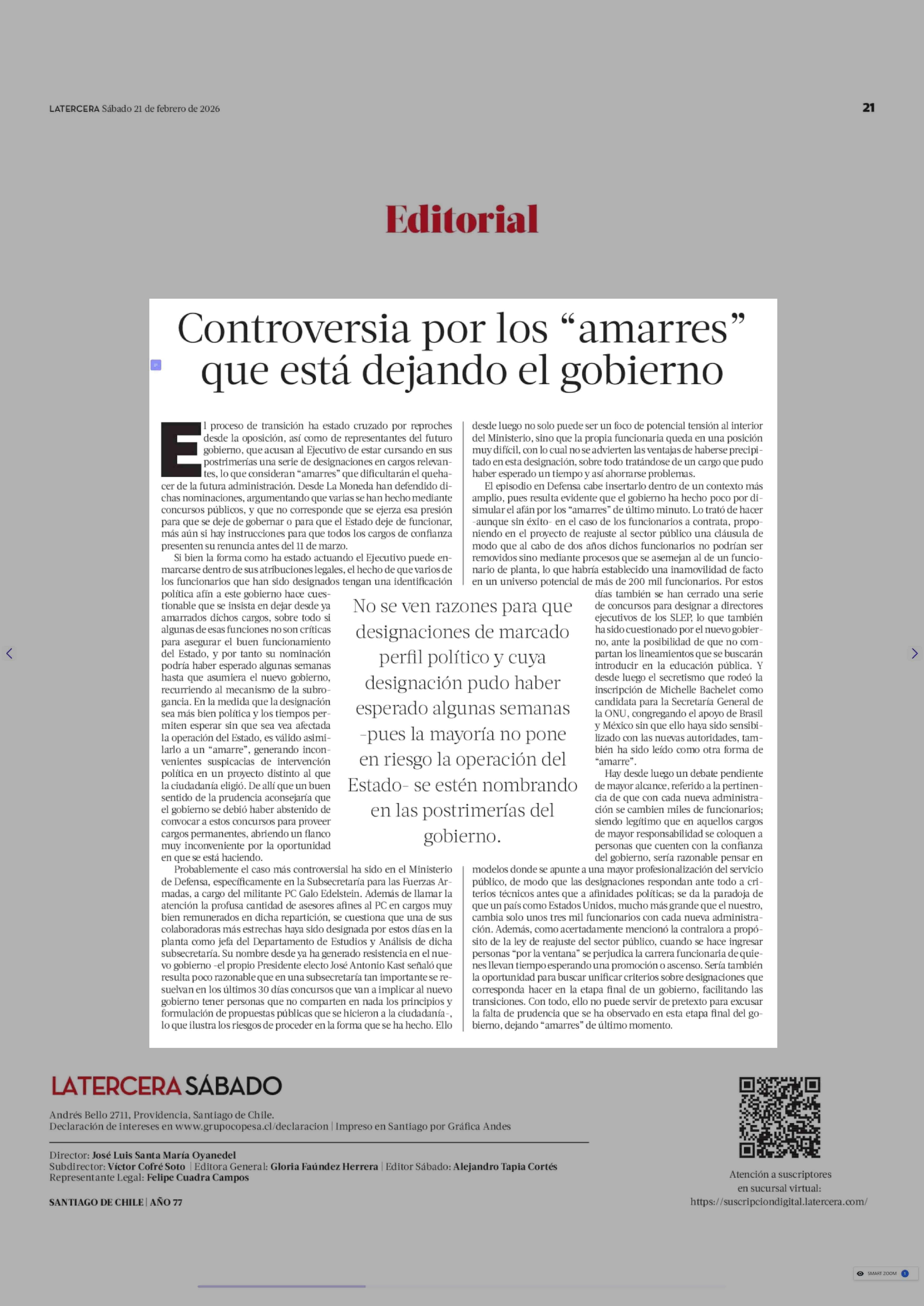 Editorial: Controversia por los "amarres" que está dejando el gobierno 21-02-2026 La Tercera |
