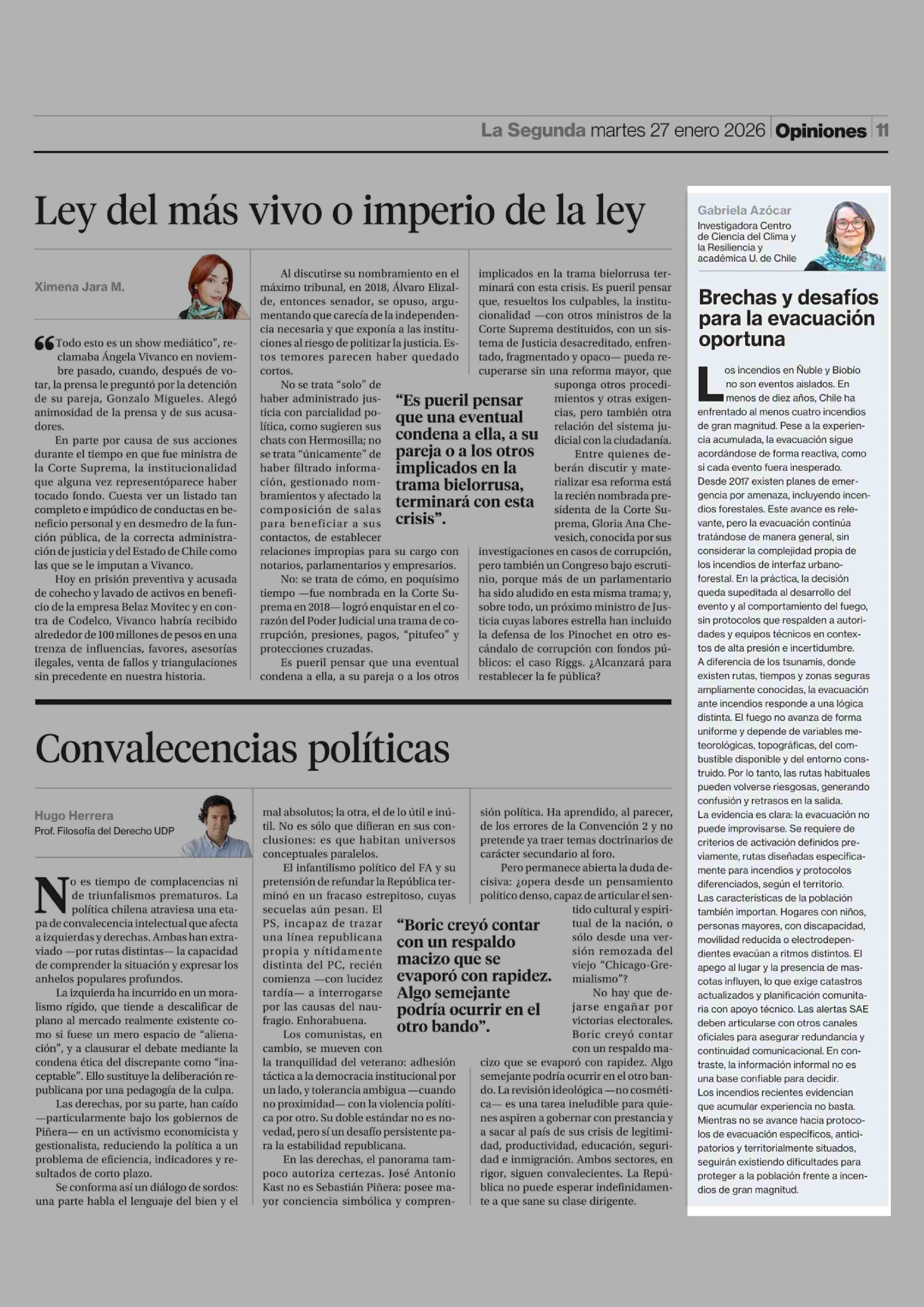 Columnas de Opinión: Brechas y desafíos para la evacuación oportuna 27-01-2026 La Segunda |