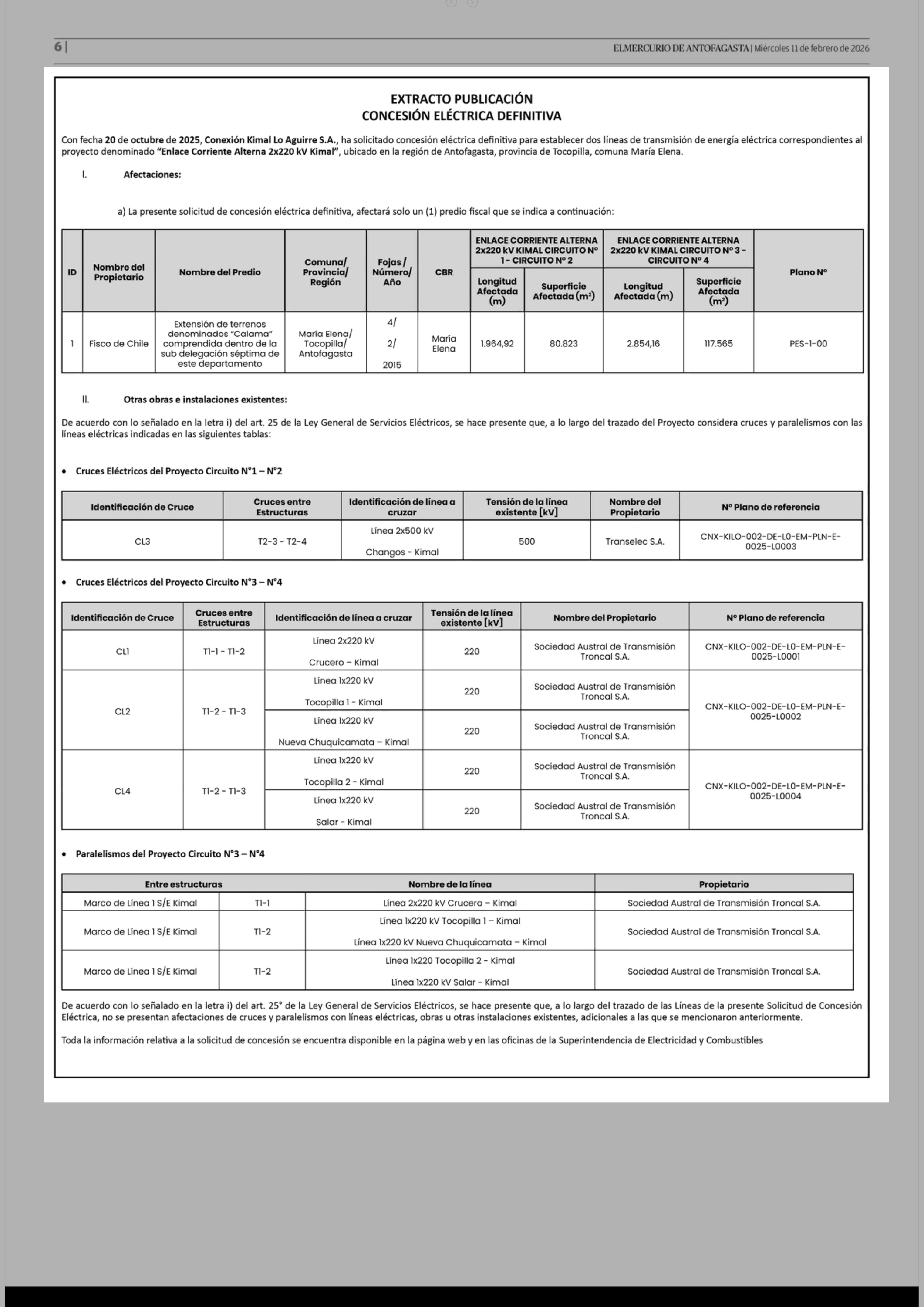 Extractos: EXTRACTO PUBLICACIÓN CONCESIÓN ELÉCTRICA DEFINITIVA 11-02-2026 El Mercurio de Antofagasta |