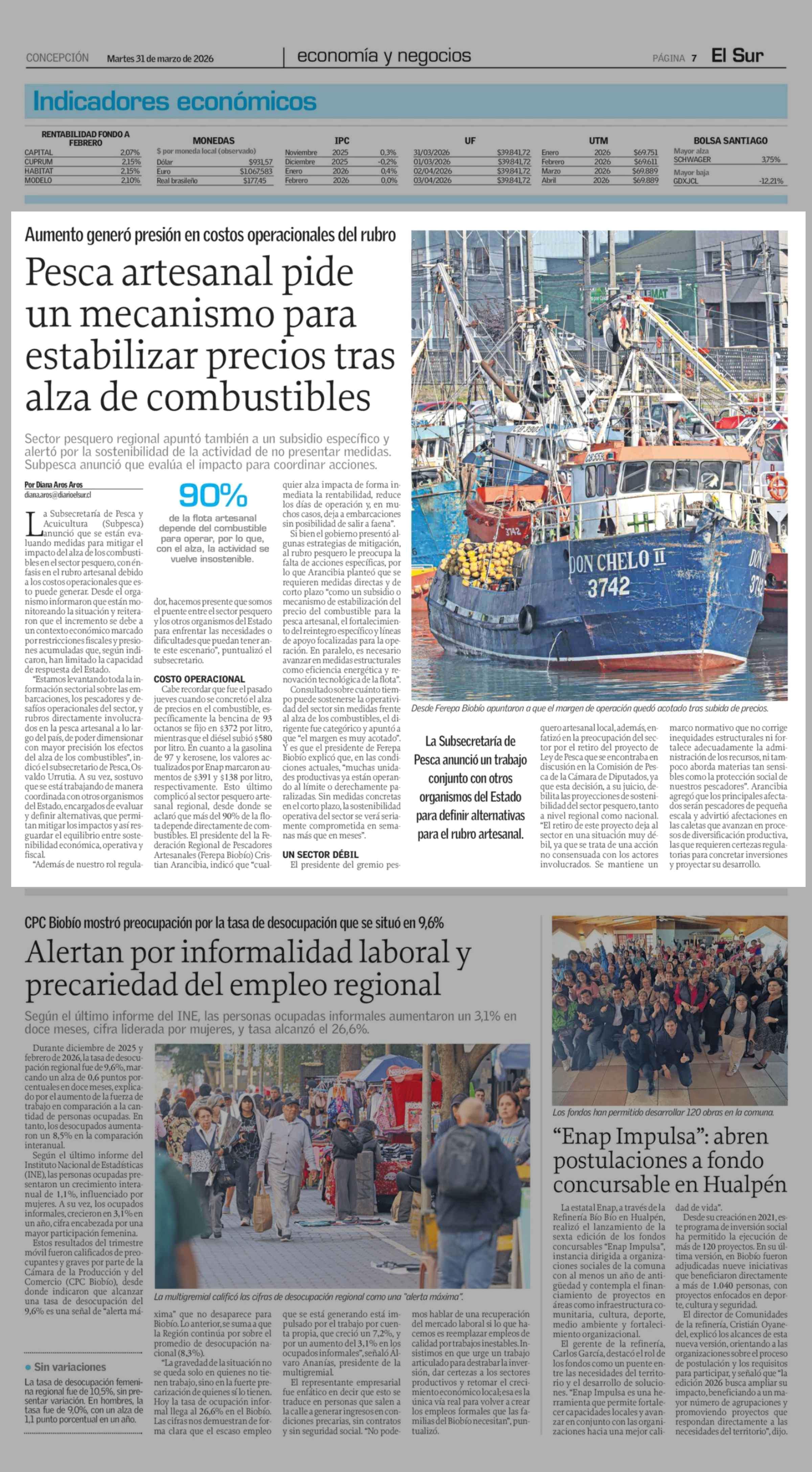 Pesca artesanal pide un mecanismo para estabilizar precios tras alza de combustibles 31-03-2026 El Sur |