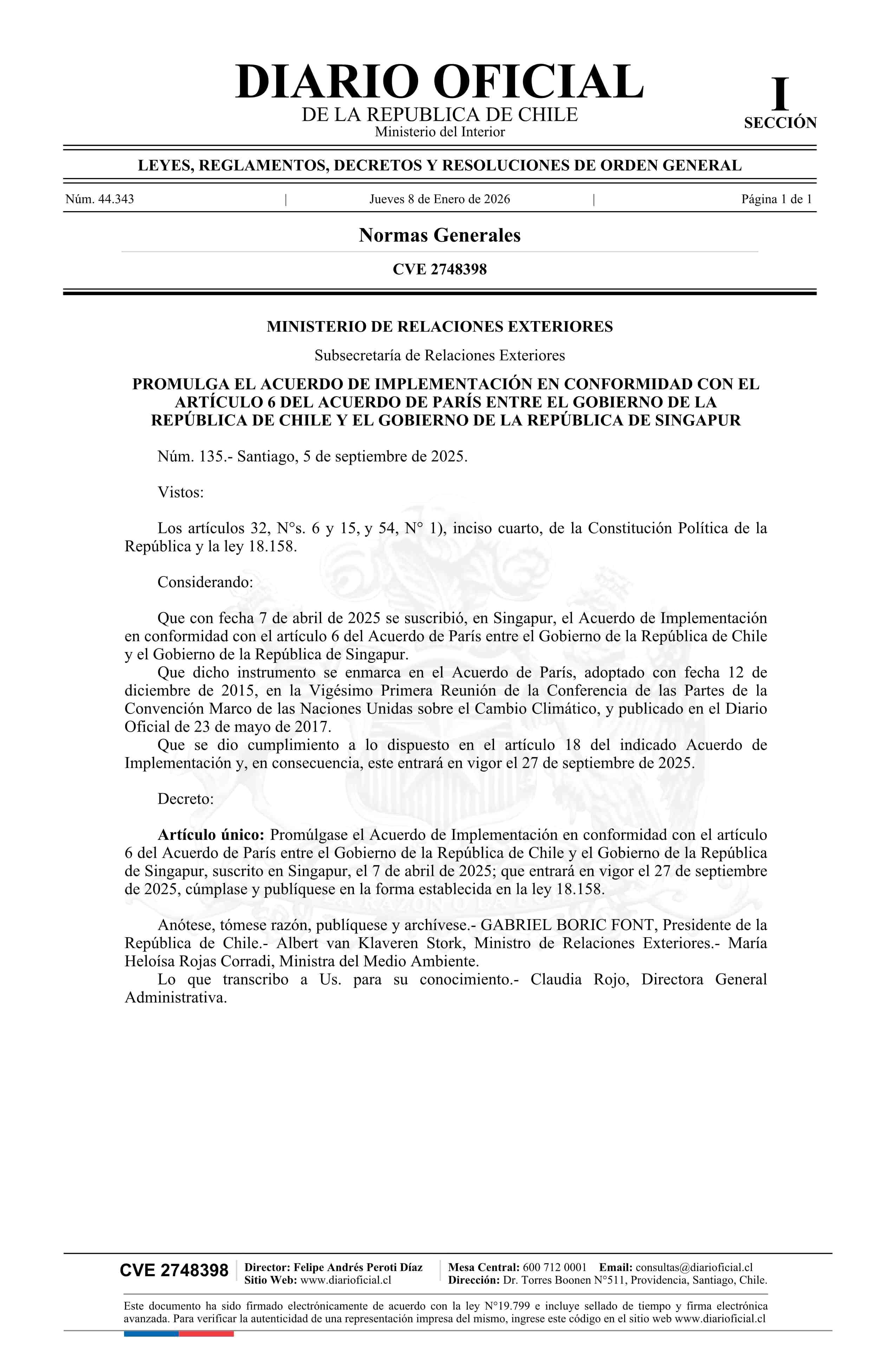 Título: Decreto número 135, de 2025.- Promulga Acuerdo de Implementación en conformidad con el artículo 6 del Acuerdo de París entre el Gobierno de la República de Chile y el Gobierno de la República de Singapur