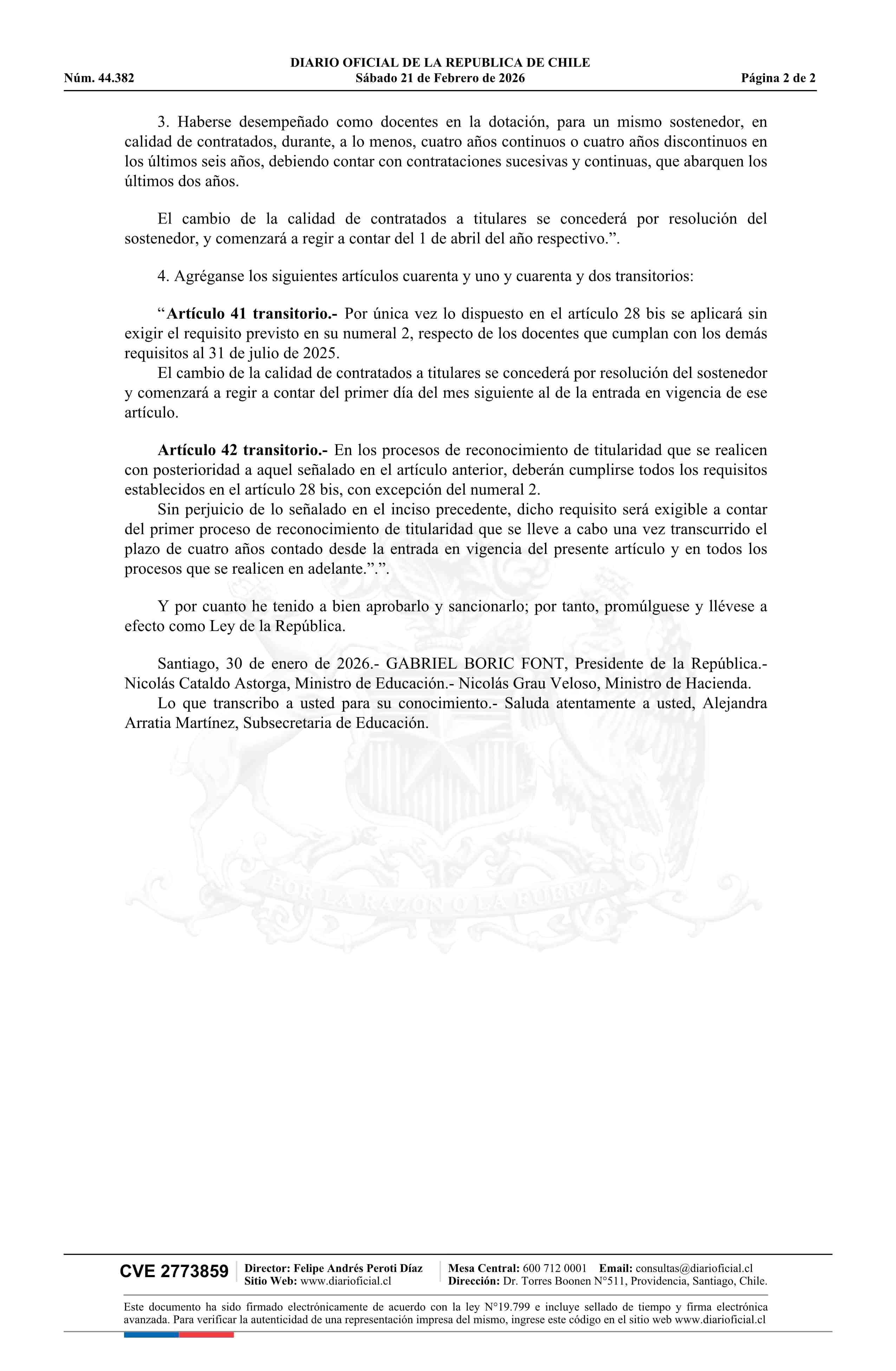 Ley número 21.803.- Establece los requisitos para otorgar la calidad de titular a los profesionales de la educación parvularia, básica o media 21-02-2026 Diario Oficial Edición Electrónica |