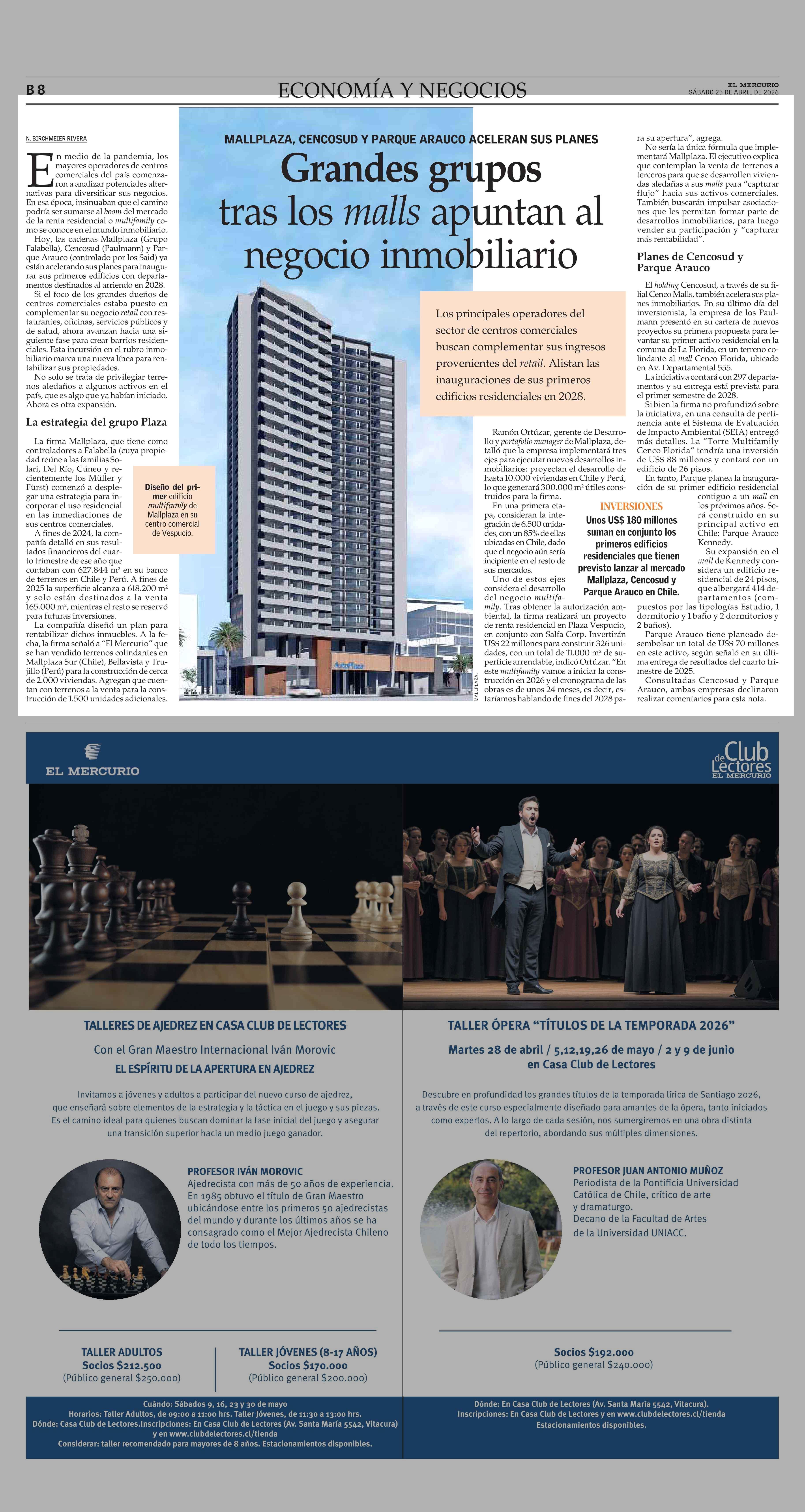 Grandes grupos tras los malls apuntan al negocio inmobiliario 25-04-2026 El Mercurio |