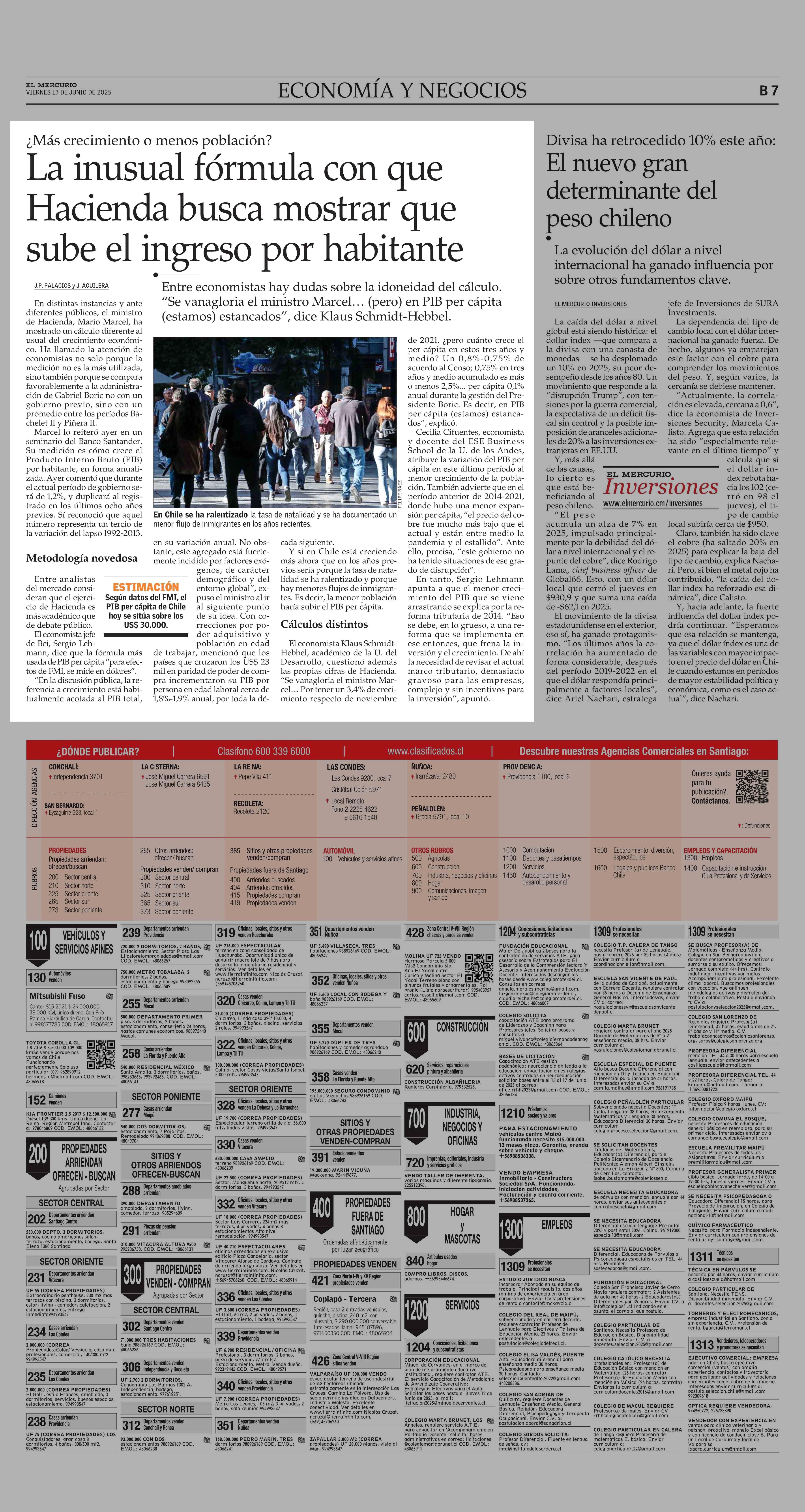 La inusual fórmula con que Hacienda busca mostrar que sube el ingreso por habitante 13-06-2025 El Mercurio |