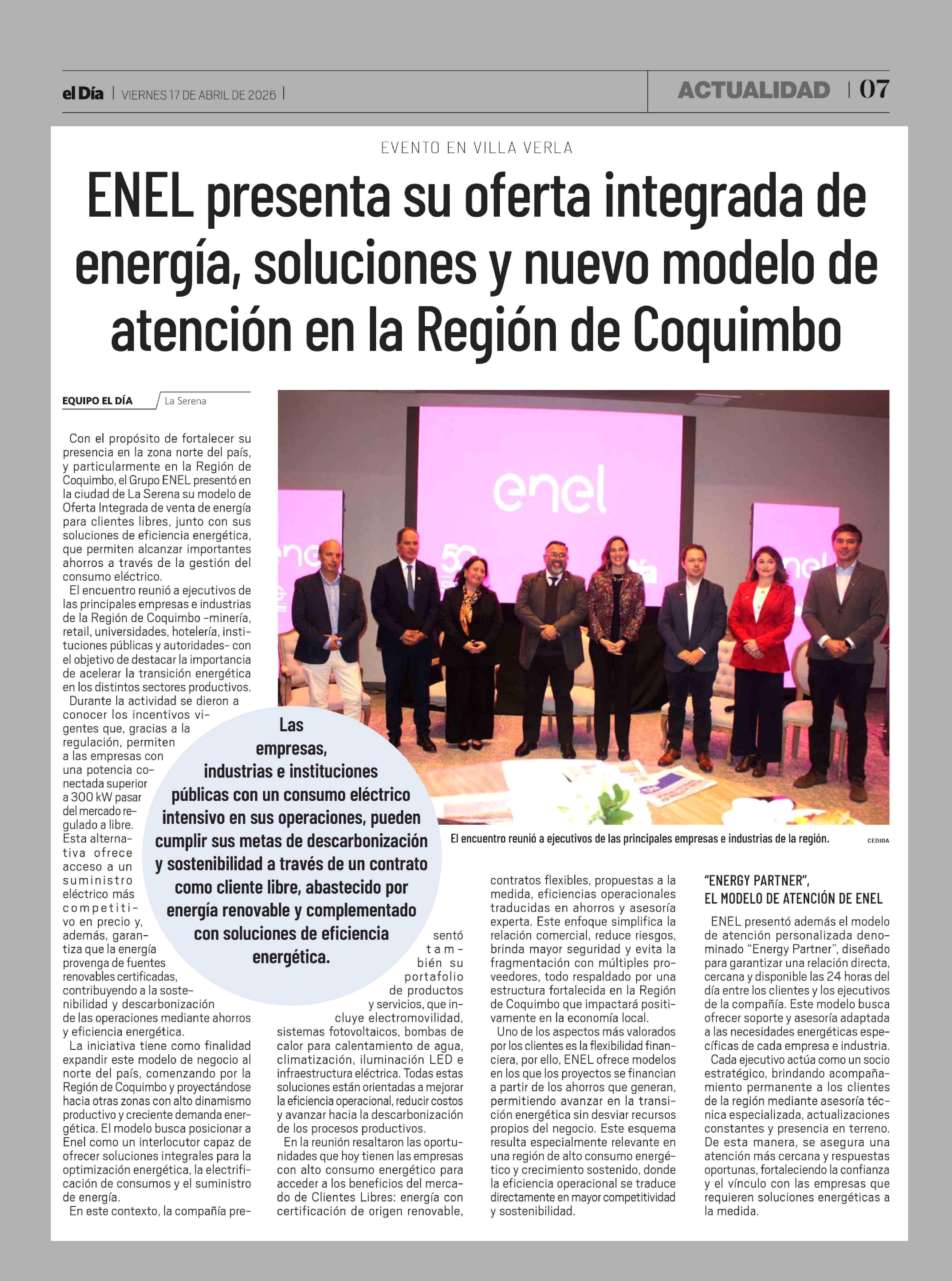 ENEL presenta su oferta integrada de energía, soluciones y nuevo modelo de atención en la Región de Coquimbo 17-04-2026 El Día |