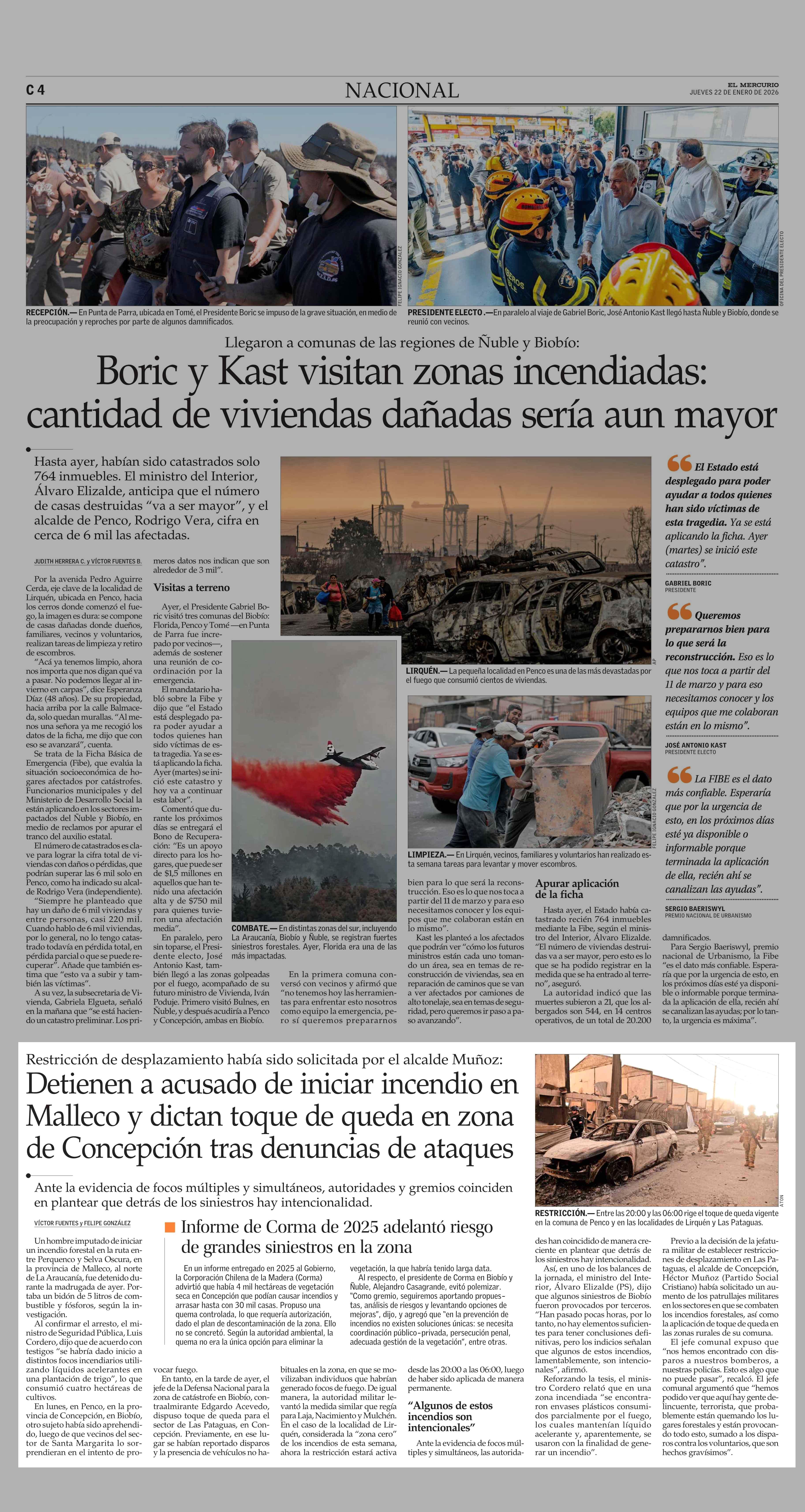 Detienen a acusado de iniciar incendio en Malleco y dictan toque de queda en zona de Concepción tras denuncias de ataques 22-01-2026 El Mercurio |