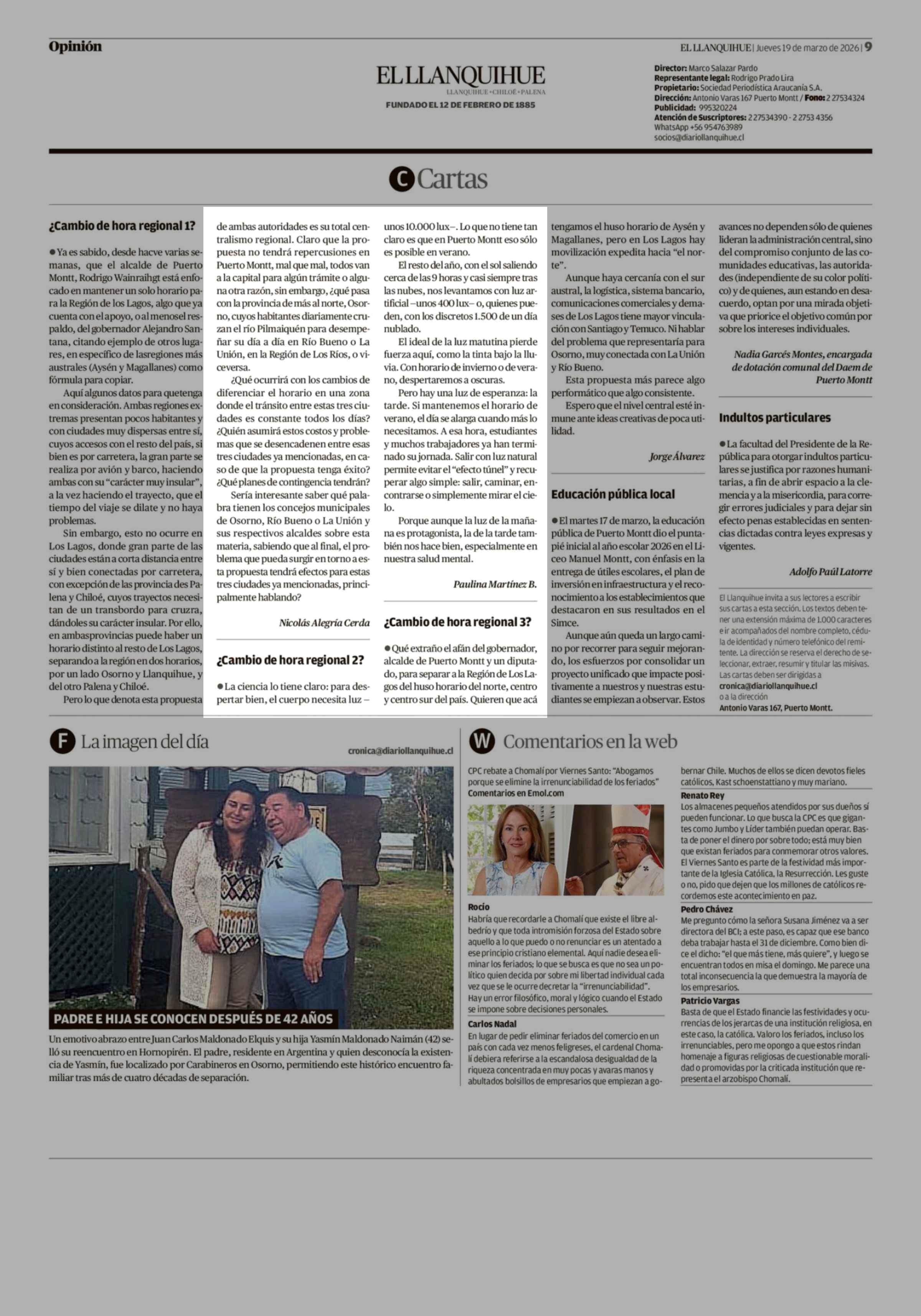 Cartas: ¿Cambio de hora regional 2? 19-03-2026 El Llanquihue |