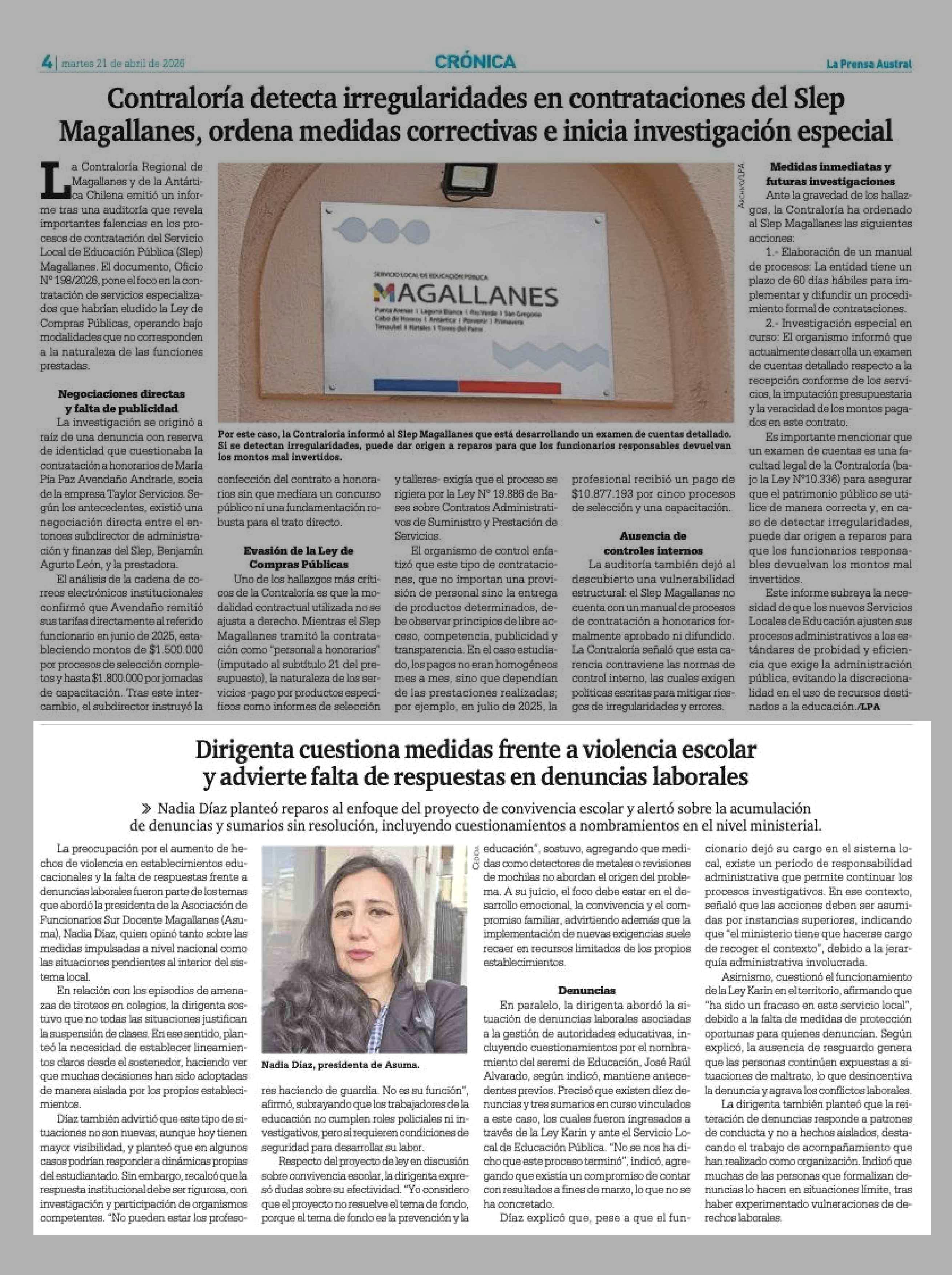 Dirigenta cuestiona medidas frente a violencia escolar y advierte falta de respuestas en denuncias laborales 21-04-2026 La Prensa Austral |
