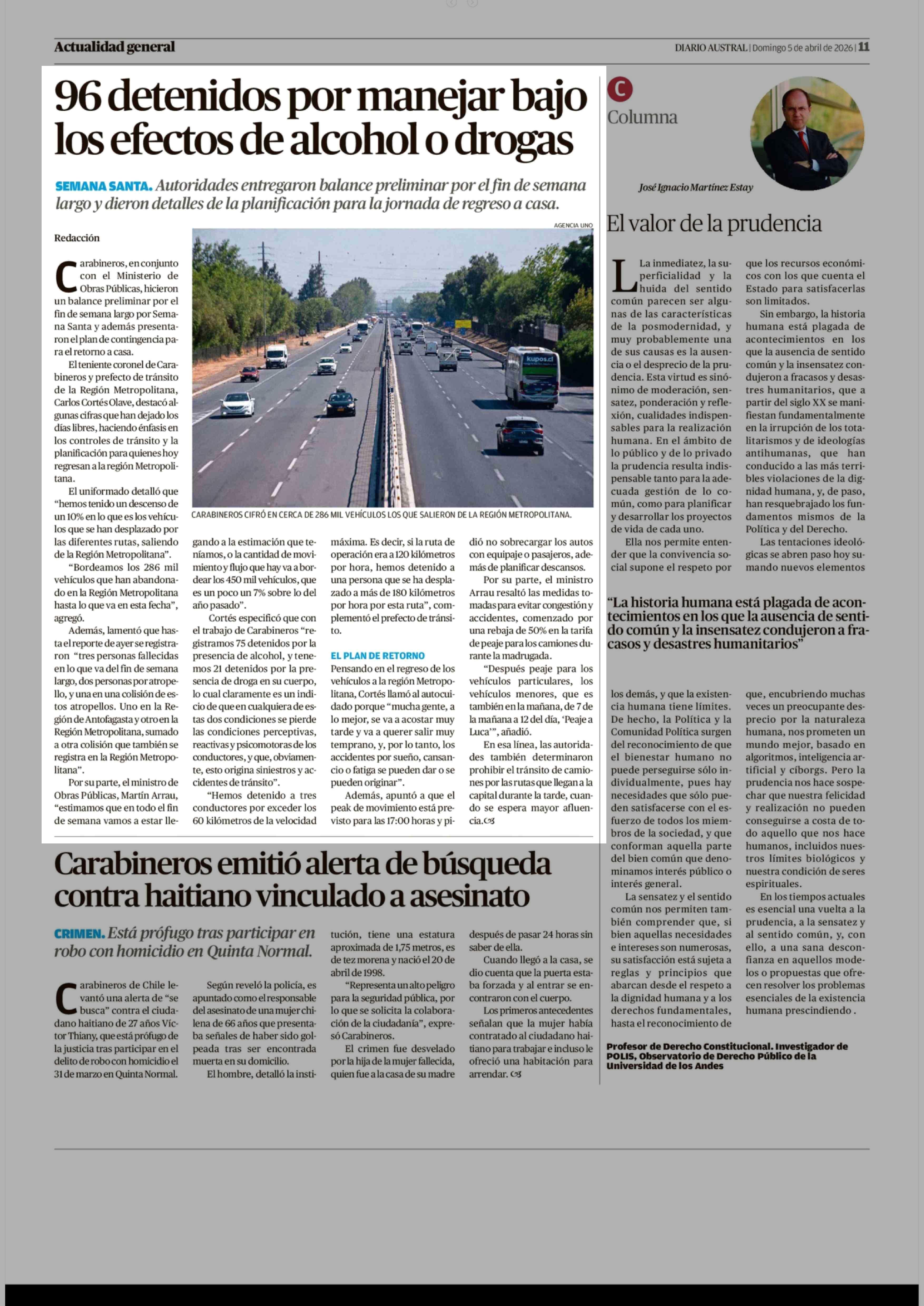 96 Detenidos por manejar bajo los efectos de alcohol o drogas 05-04-2026 Diario Austral Región de Los Ríos |