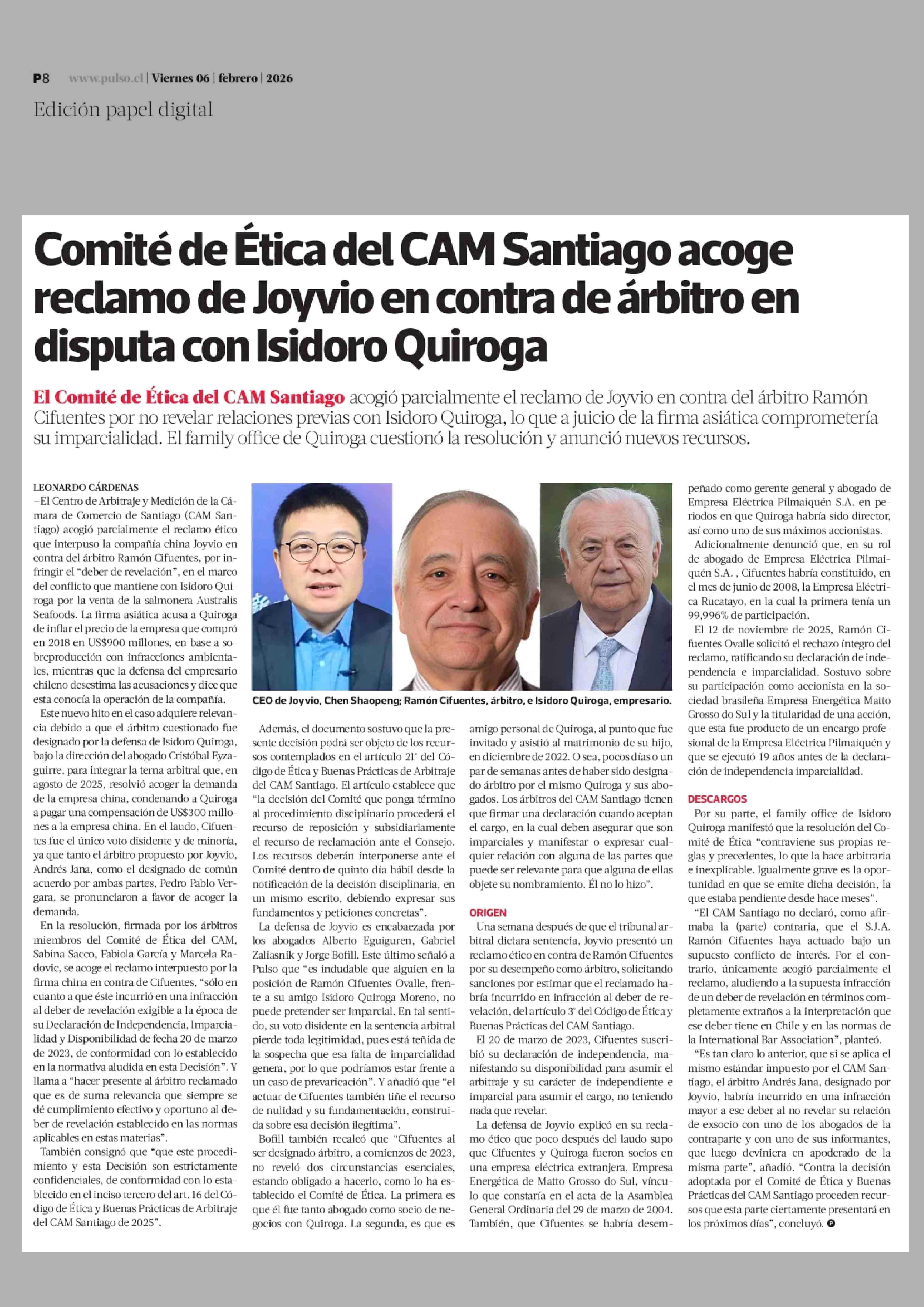 Comité de Ética del CAM Santiago acoge reclamo de Joyvio en contra de árbitro en disputa con Isidoro Quiroga 06-02-2026 La Tercera |