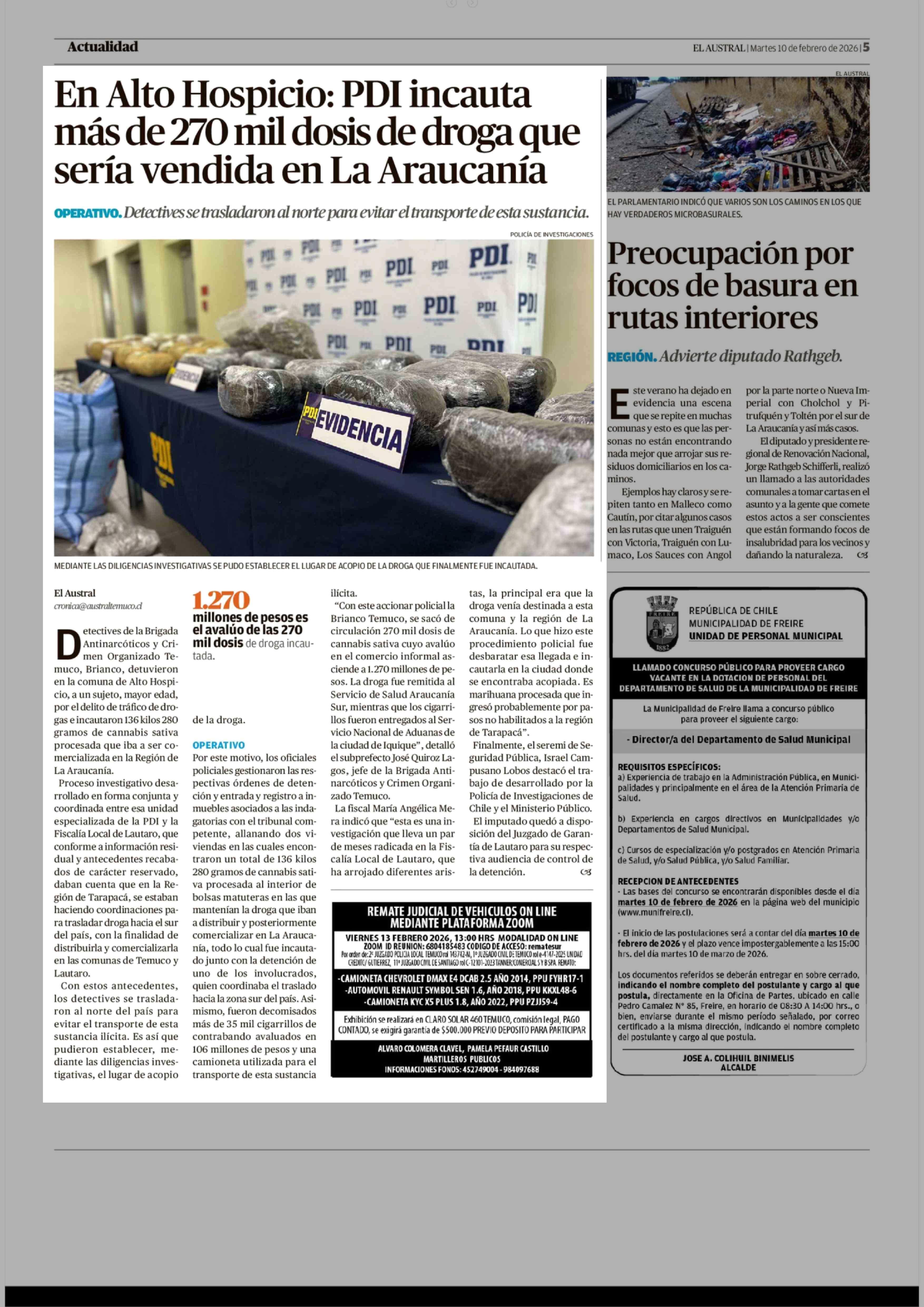 En Alto Hospicio: PDI incauta más de 270 mil dosis de droga que sería vendida en La Araucanía 10-02-2026 El Austral de la Araucanía |