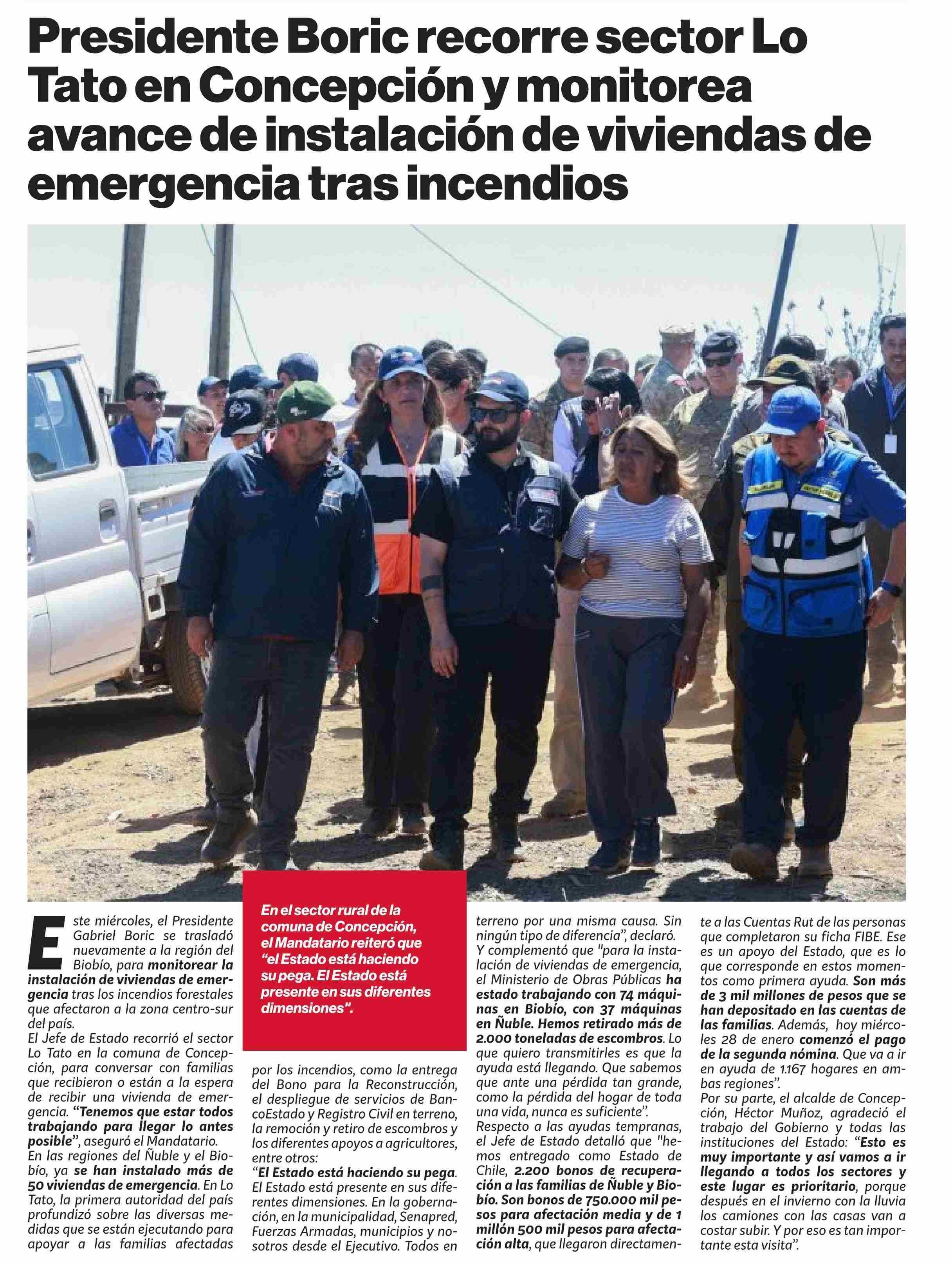 Presidente Boric recorre sector Lo Tato en Concepción y monitorea avance de instalación de viviendas de emergencia tras incendios 28-01-2026 Puranoticia.cl |