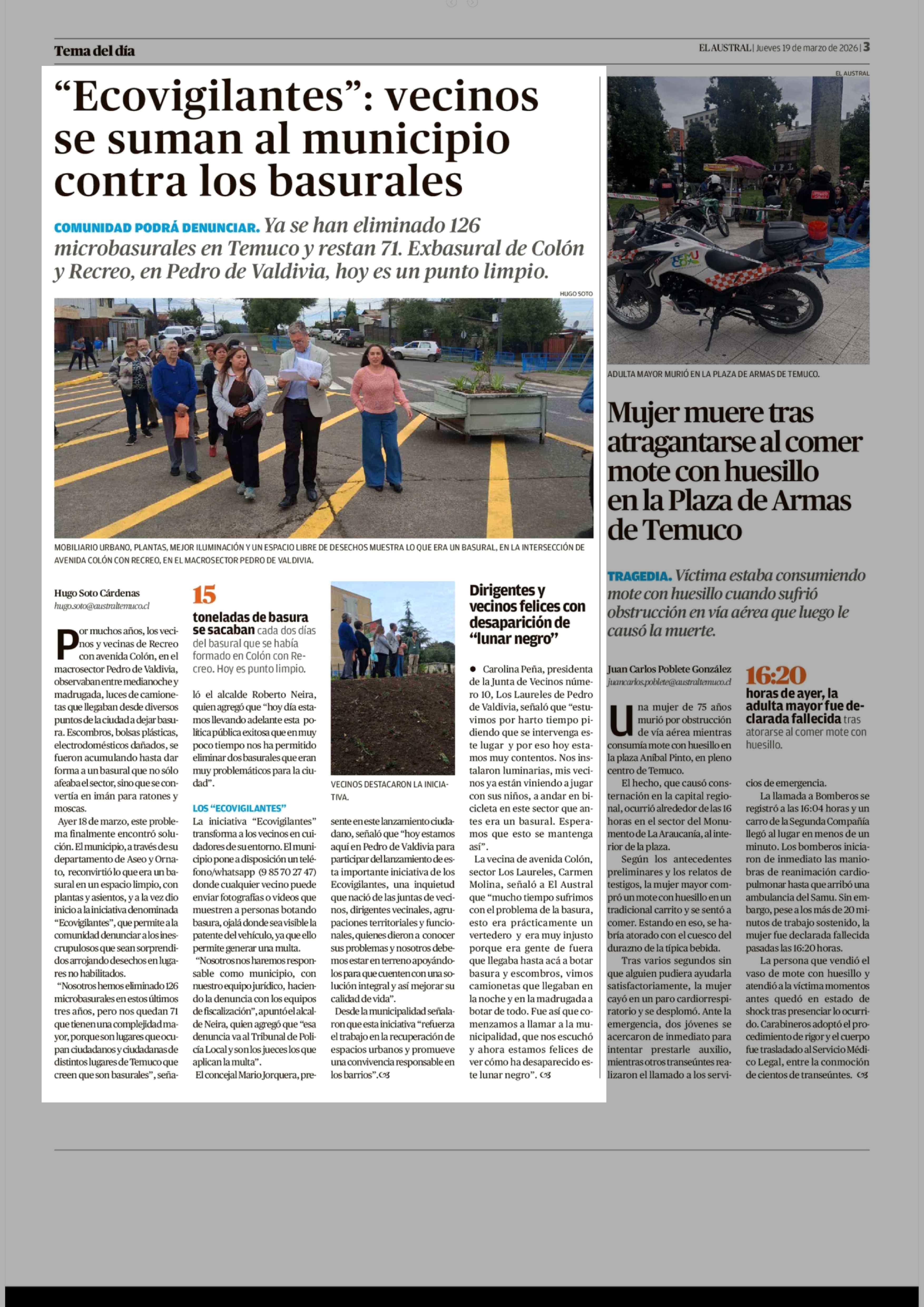 "Ecovigilantes": vecinos se suman al municipio contra los basurales 19-03-2026 El Austral de la Araucanía |