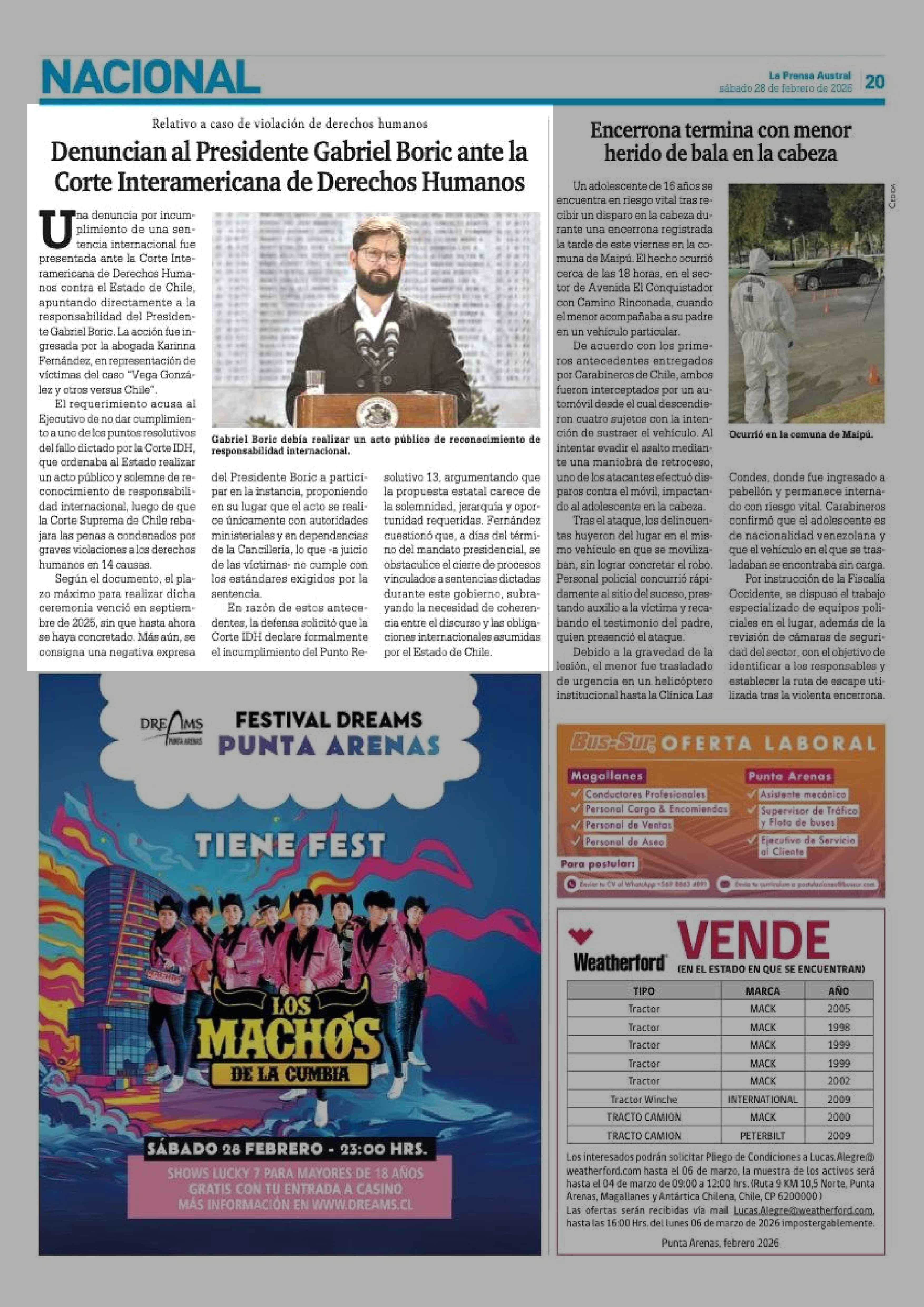 Denuncian al Presidente Gabriel Boric ante la Corte Interamericana de Derechos Humanos 28-02-2026 La Prensa Austral |