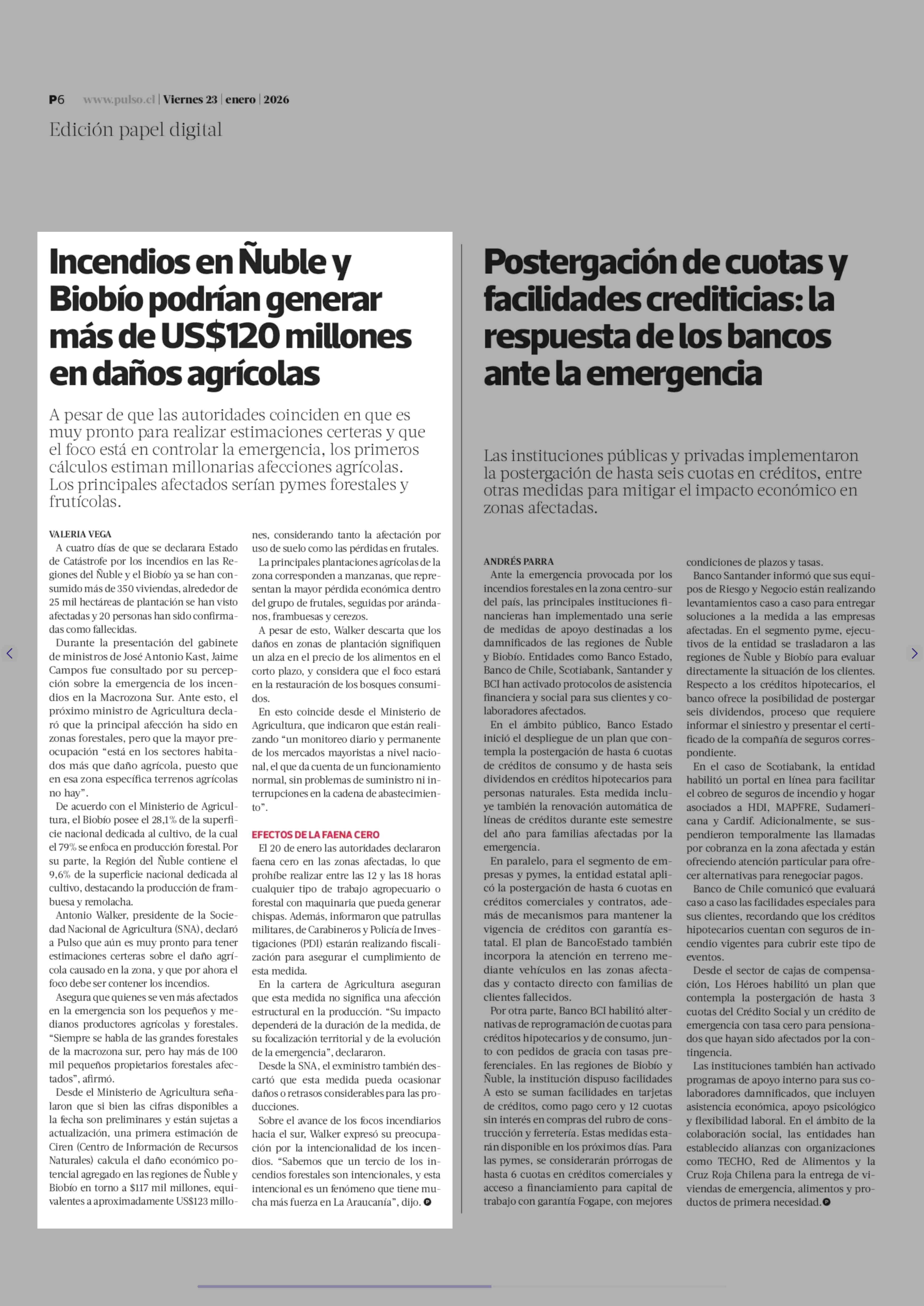 Incendios en Ñuble y Biobio podrían generar más de US$120 millones en daños agrícolas 23-01-2026 La Tercera |