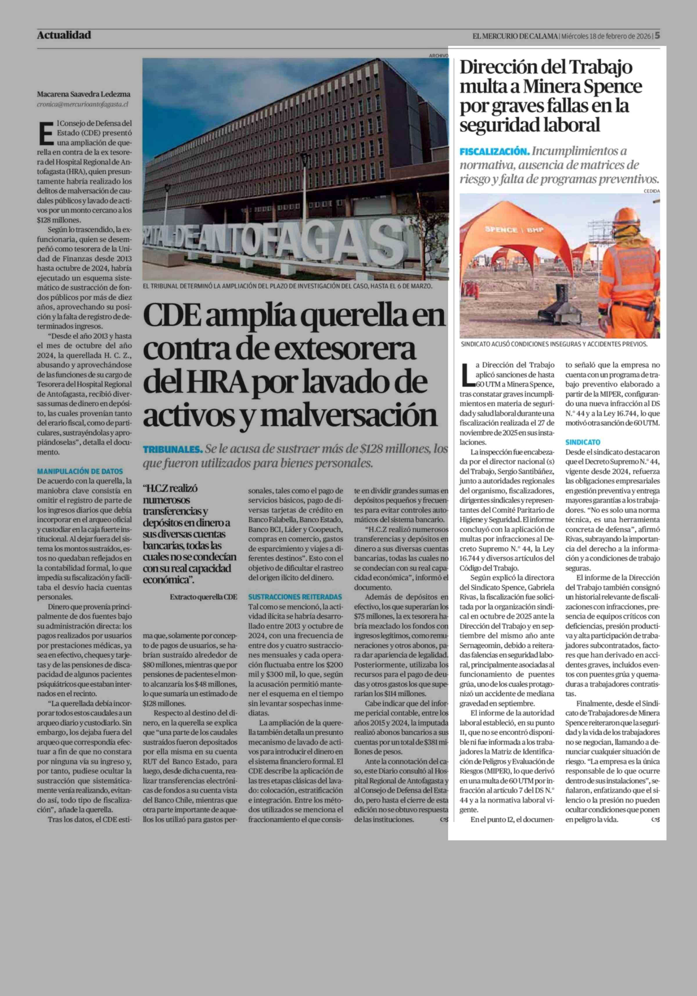 Dirección del Trabajo multa a Minera Spence por graves fallas en la seguridad laboral 18-02-2026 El Mercurio de Calama |
