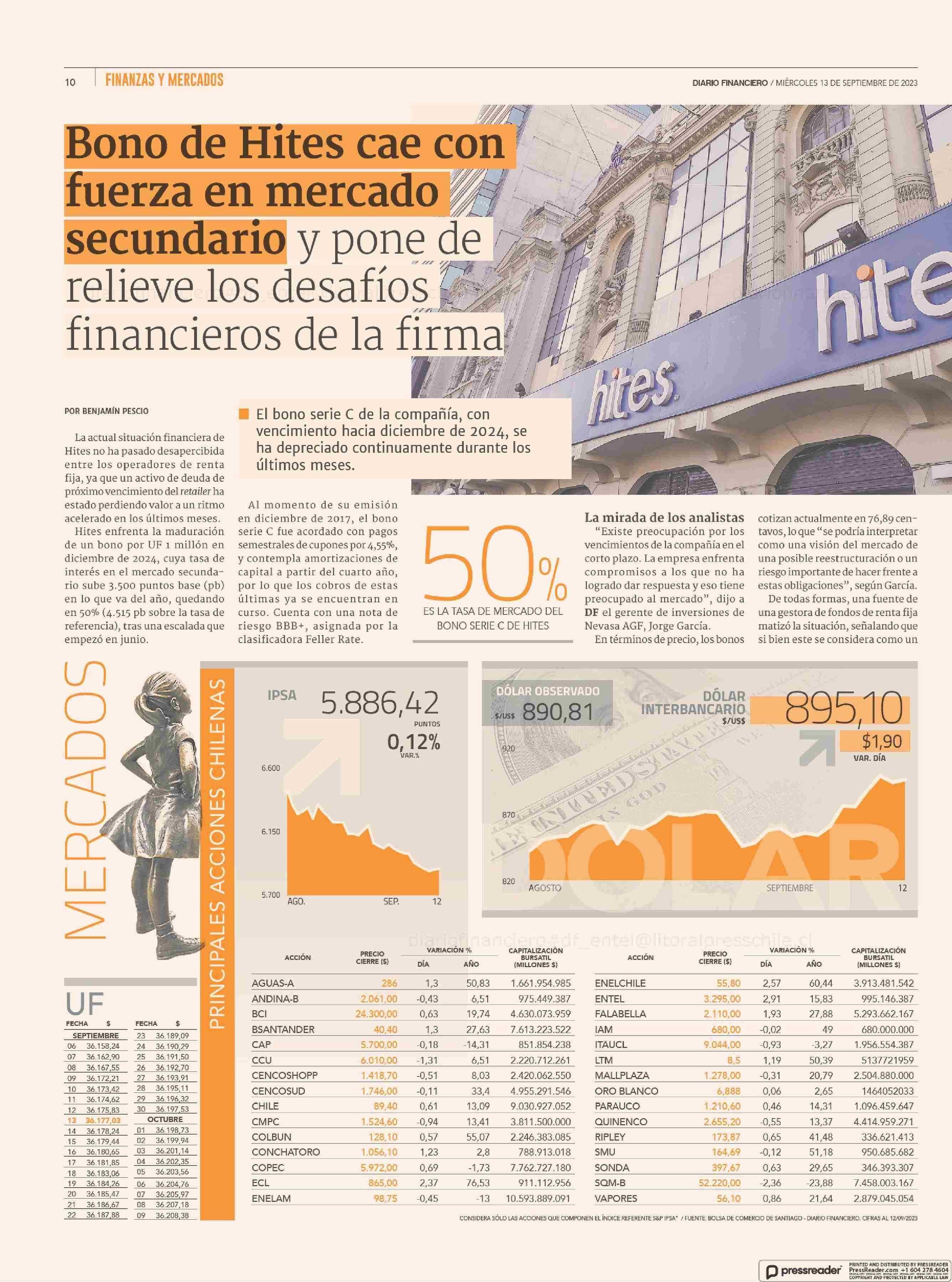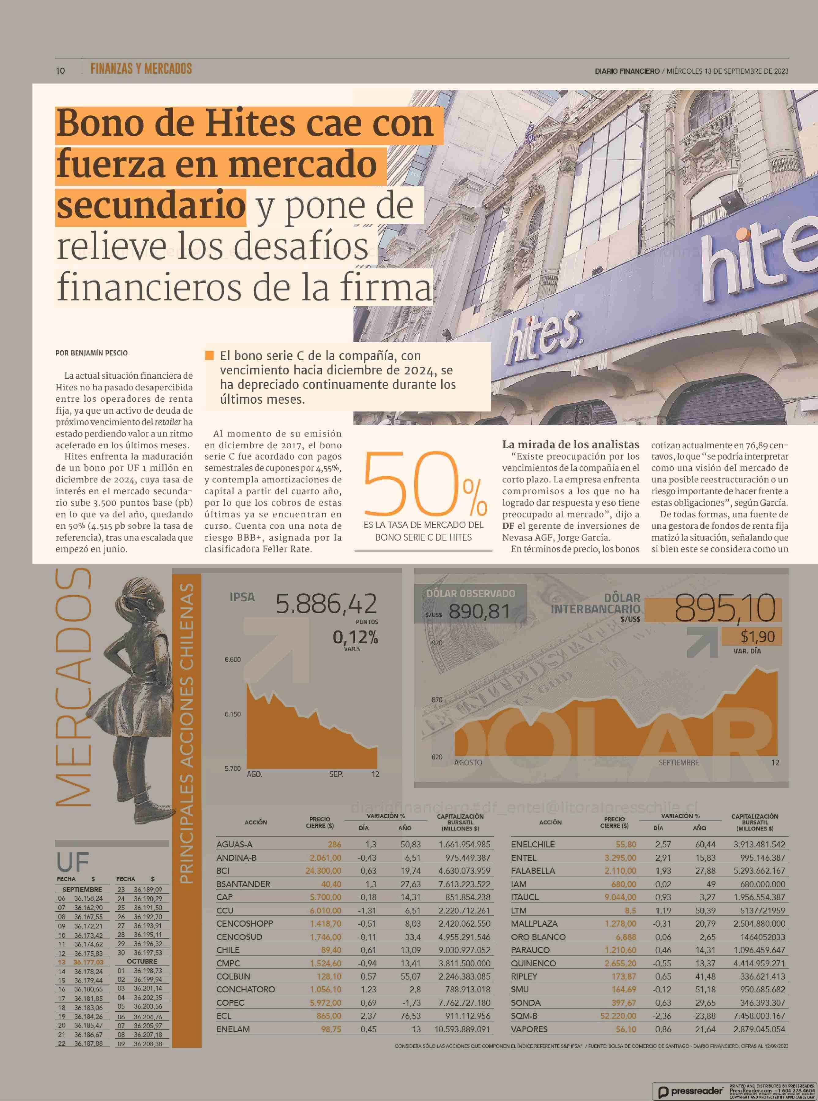 Bono de Hites cae con fuerza en mercado secundario y pone de relieve los desafíos financieros de la firma 13-09-2023 Diario Financiero |