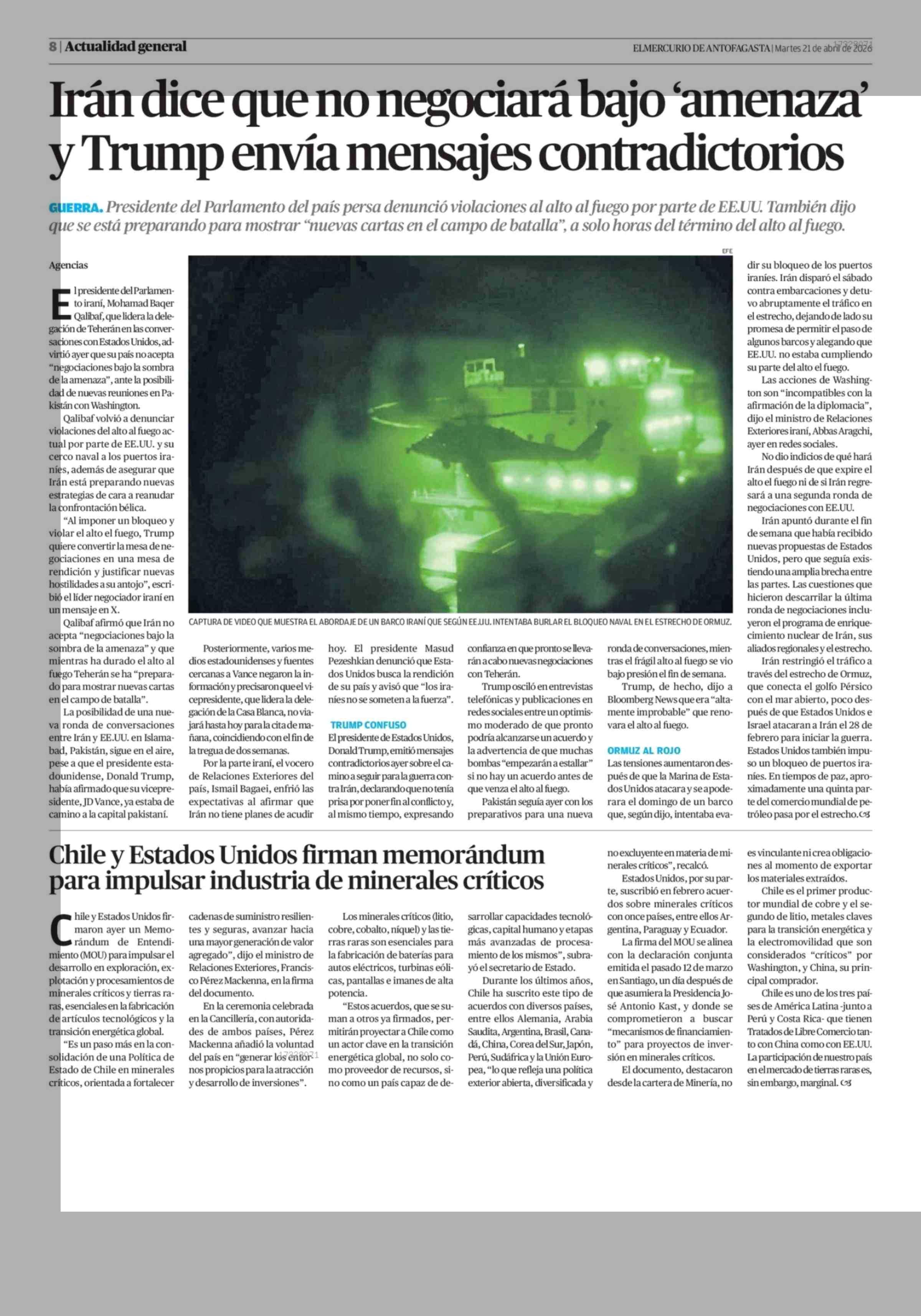 Irán dice que no negociará bajo 'amenaza' y Trump envía mensajes contradictorios 21-04-2026 El Mercurio de Antofagasta |