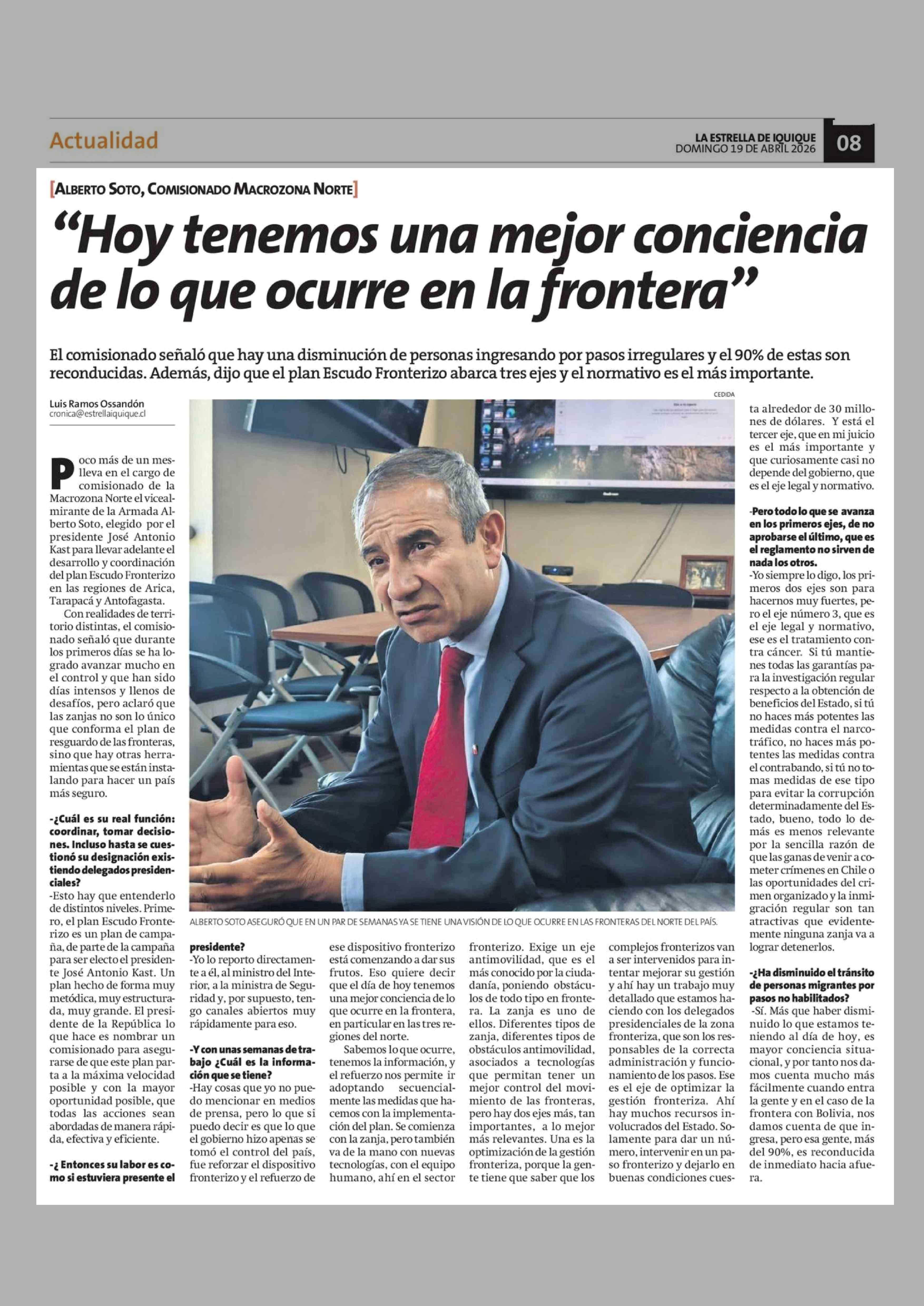 "Hoy tenemos una mejor conciencia de lo que ocurre en la frontera" 19-04-2026 La Estrella de Iquique |