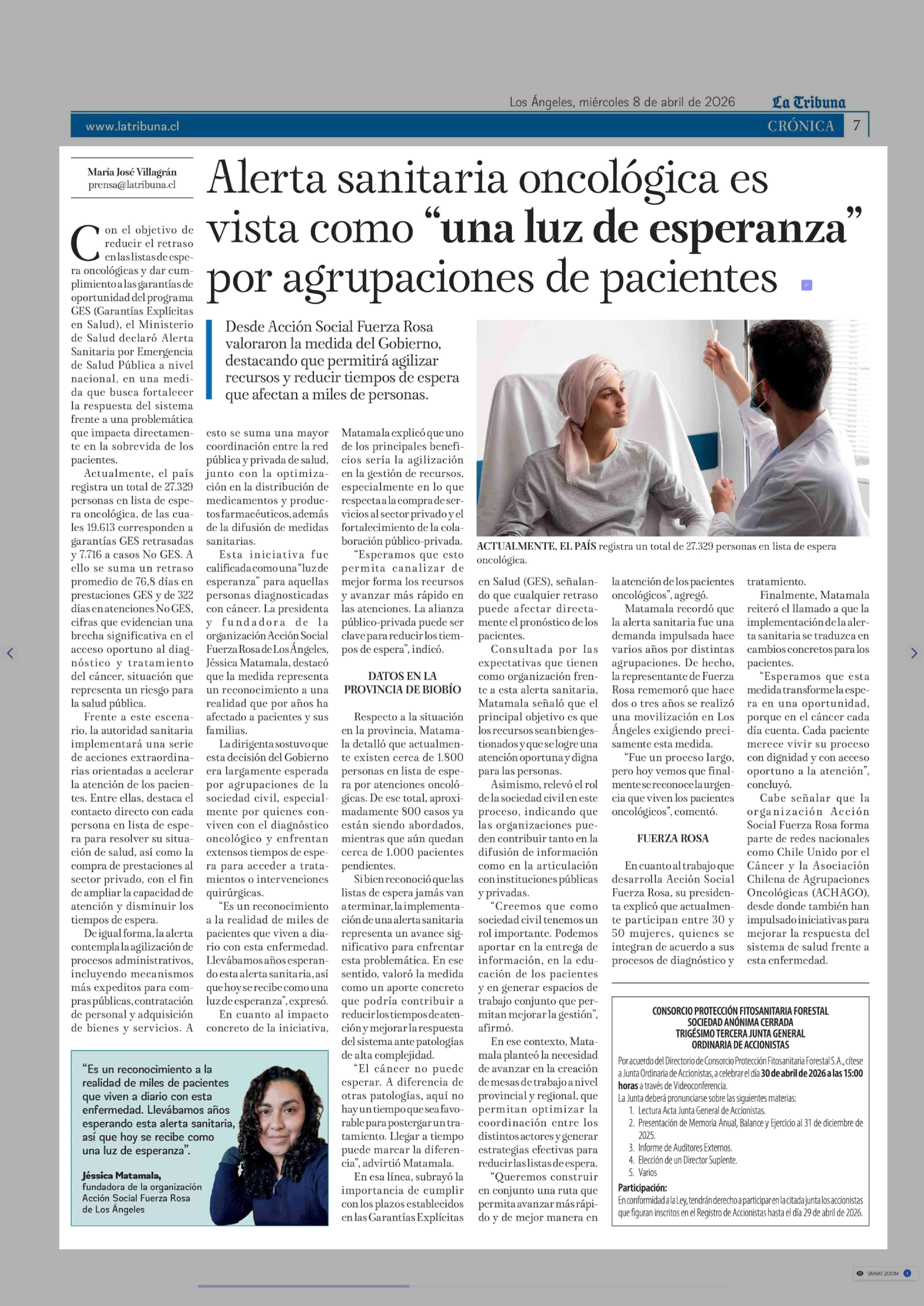 Alerta sanitaria oncológica es vista como "una luz de esperanza" por agrupaciones de pacientes 08-04-2026 La Tribuna |