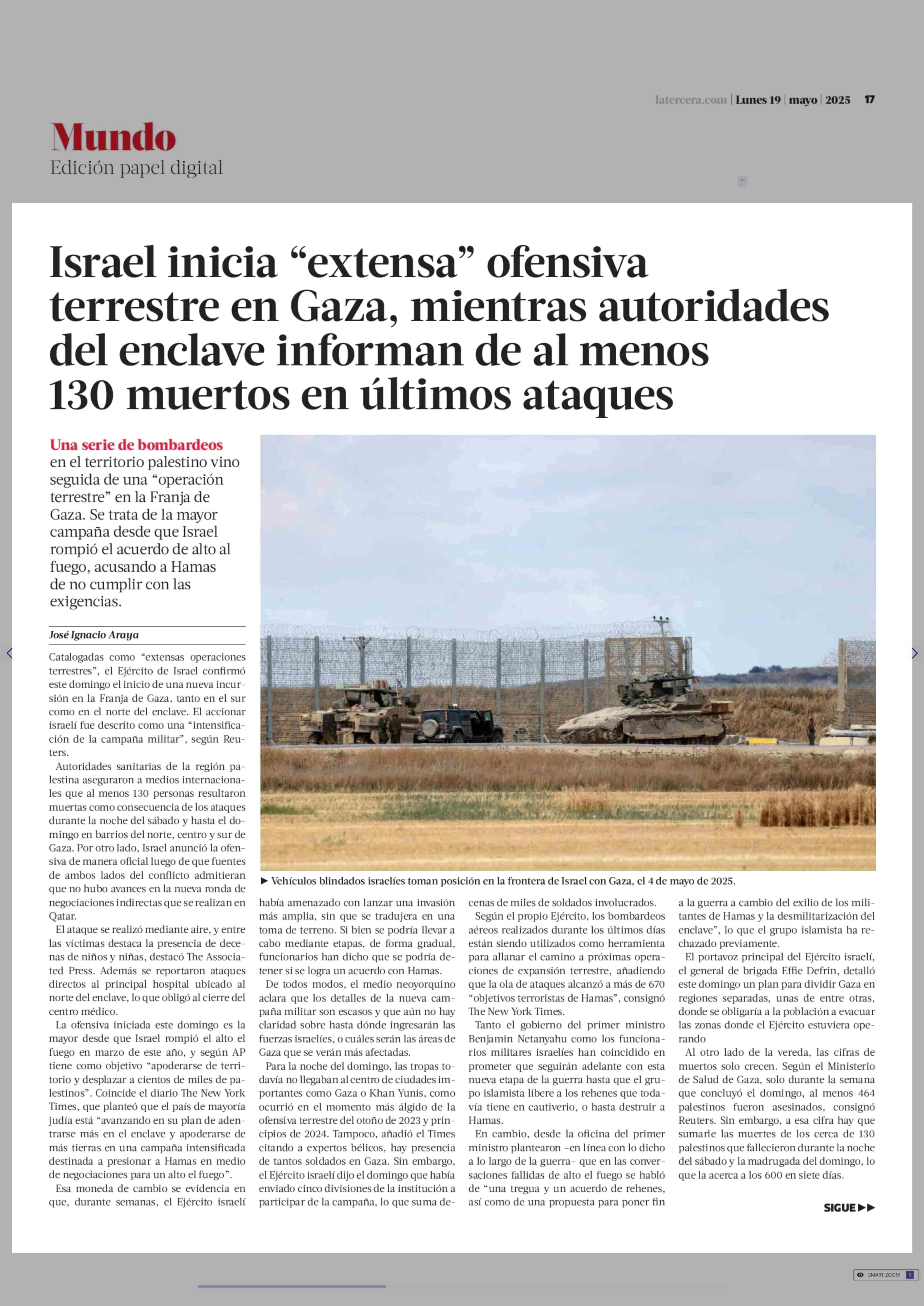 Israel inicia “extensa” ofensiva terrestre en Gaza, mientras autoridades del enclave informan de al menos 130 muertos en últimos ataques 19-05-2025 La Tercera |