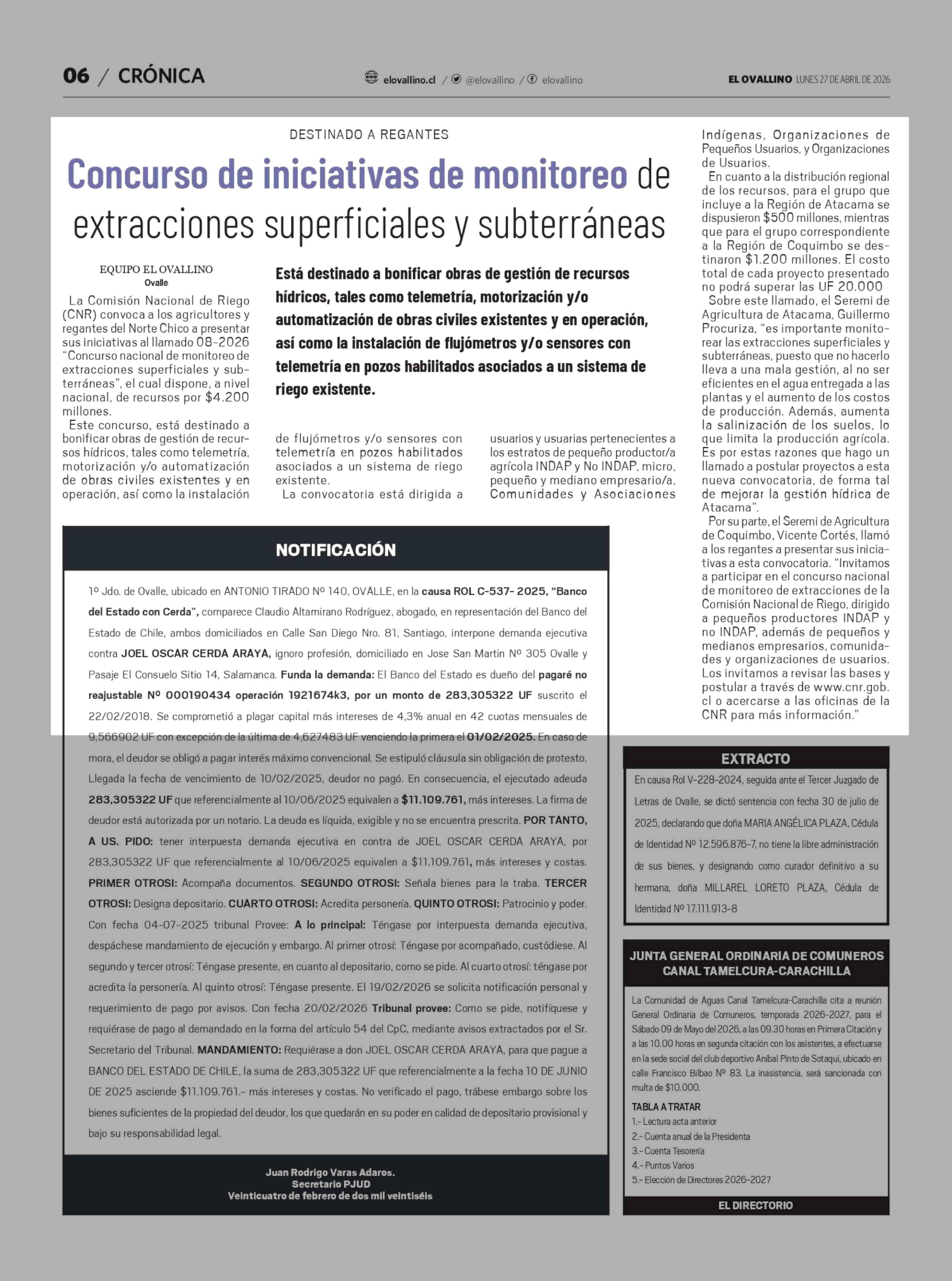 Concurso de iniciativas de monitoreo de extracciones superficiales y subterráneas 27-04-2026 El Ovallino |