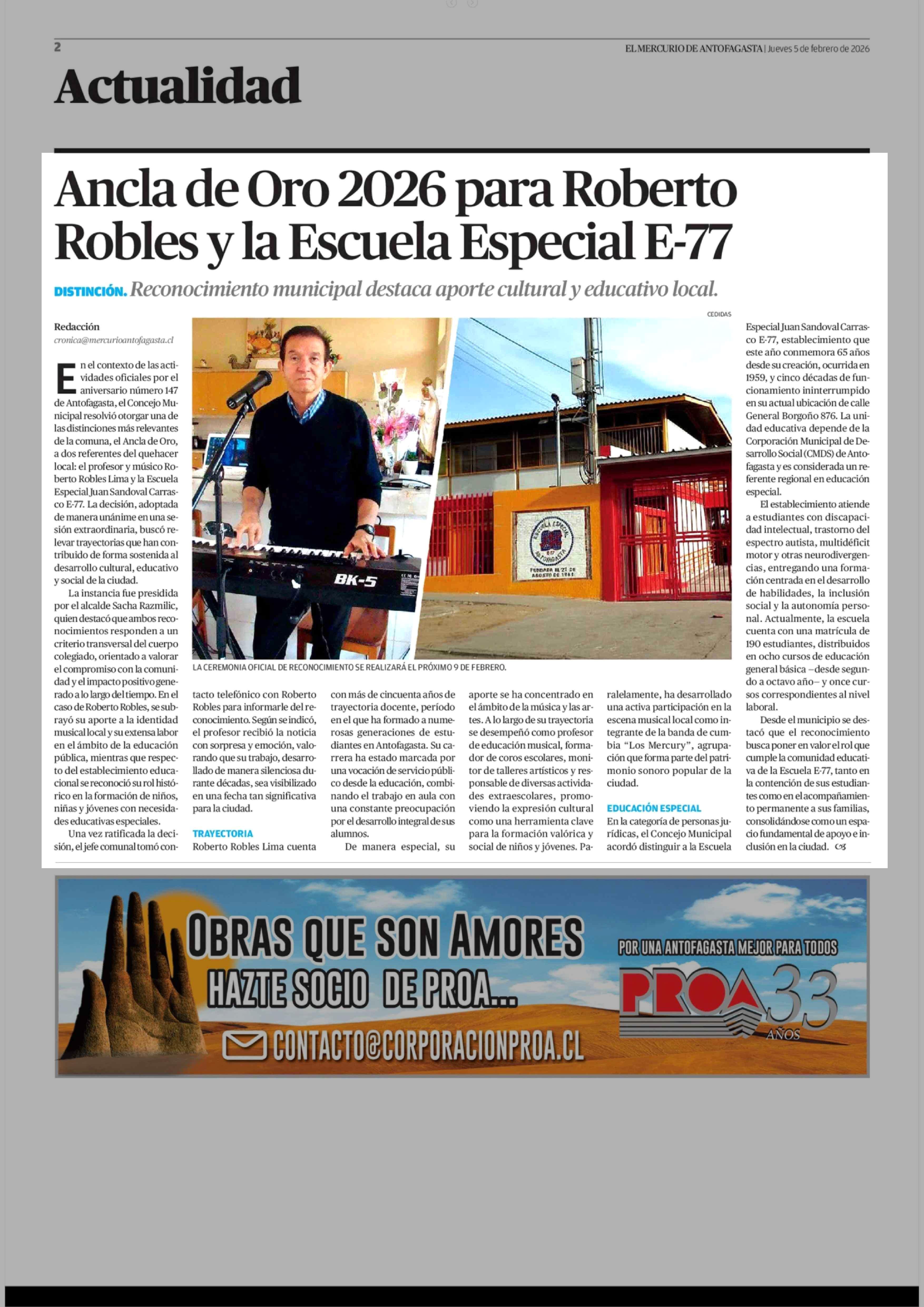 Título: Ancla de Oro 2026 para Roberto Robles y la Escuela Especial E-77