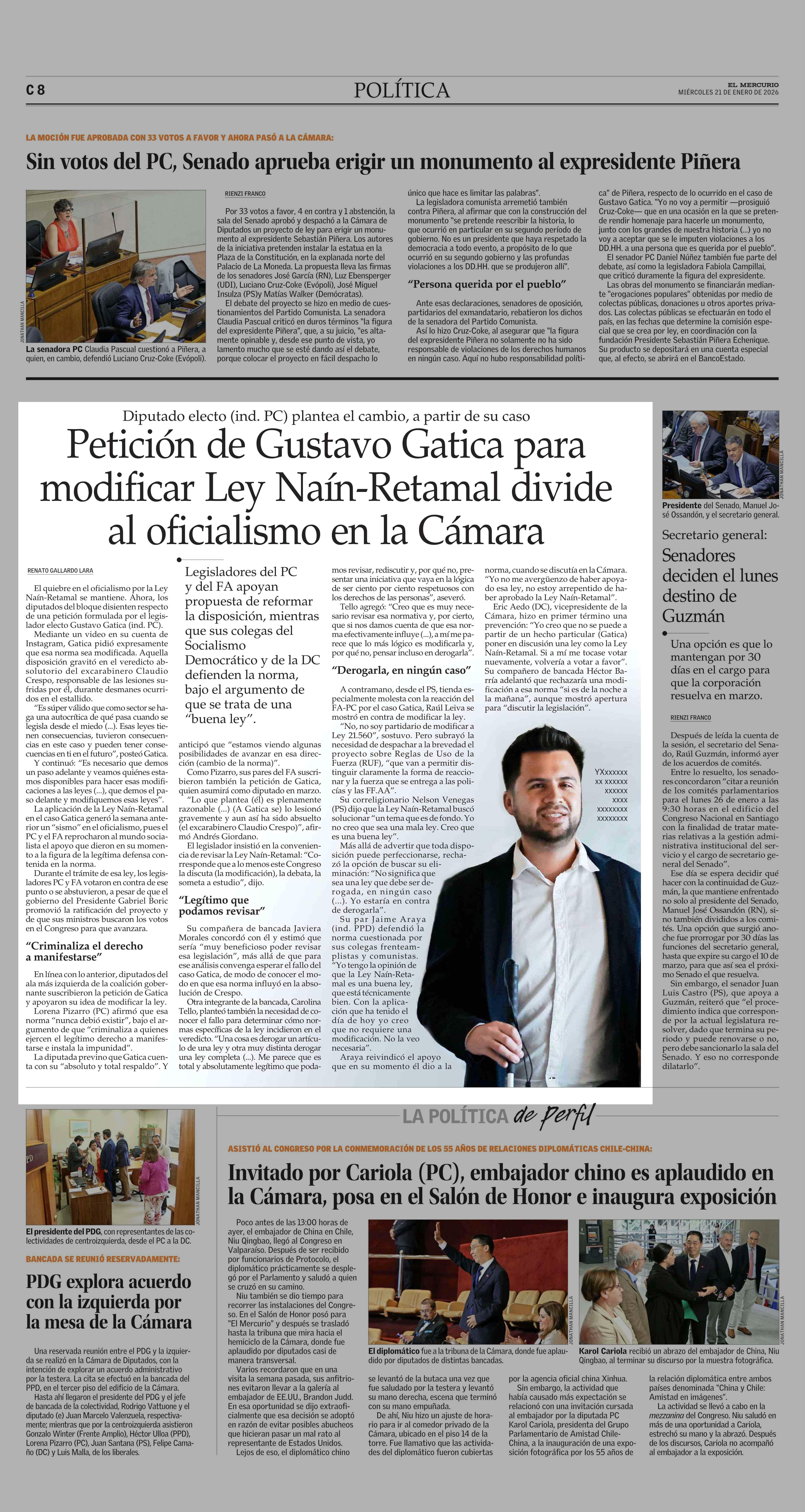 Petición de Gustavo Gatica para modificar Ley Naín-Retamal divide al oficialismo en la Cámara 21-01-2026 El Mercurio |