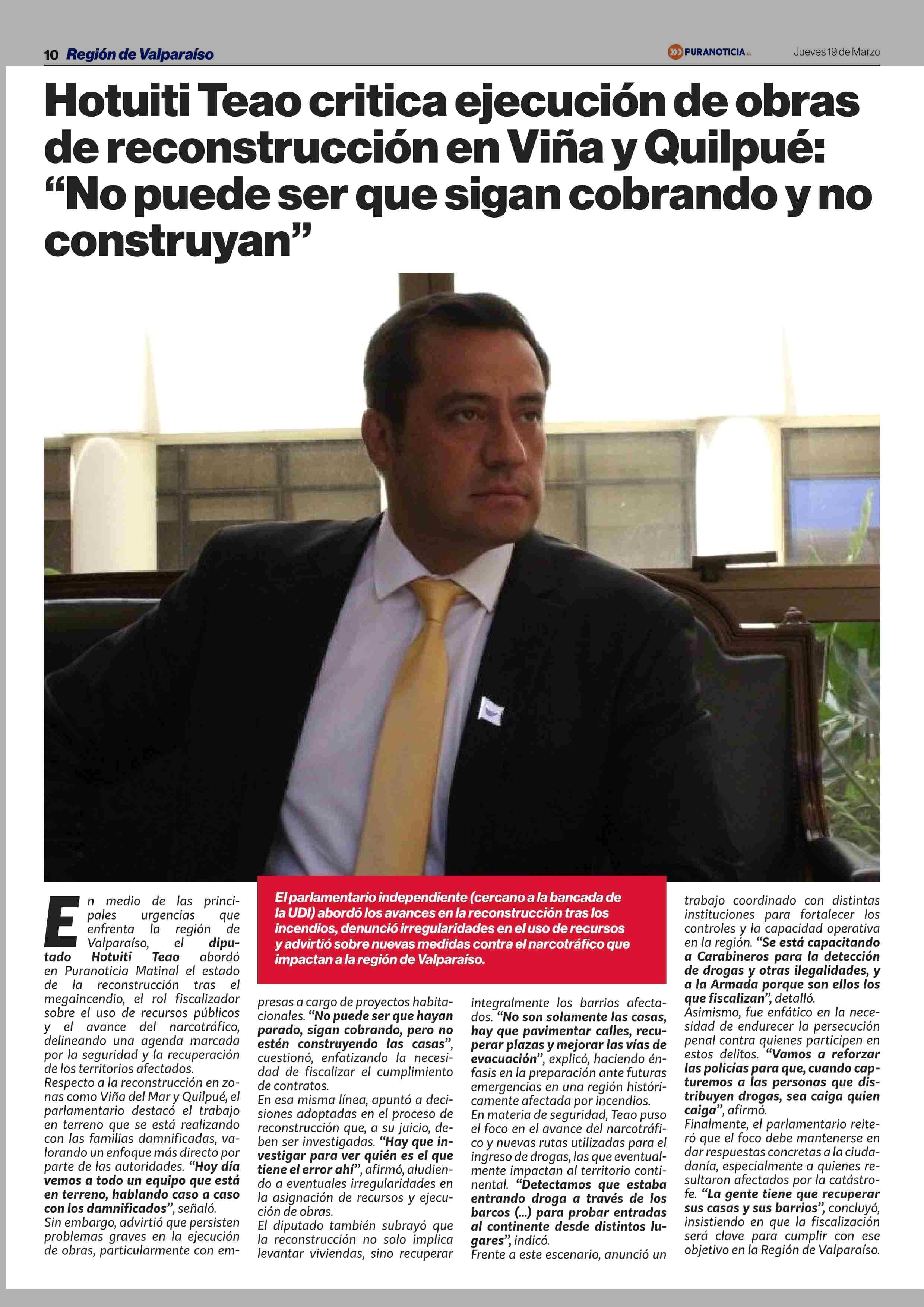 Hotuiti Teao critica ejecución de obras de reconstrucción en Viña y Quilpué: “No puede ser que sigan cobrando y no construyan” 19-03-2026 Puranoticia.cl |