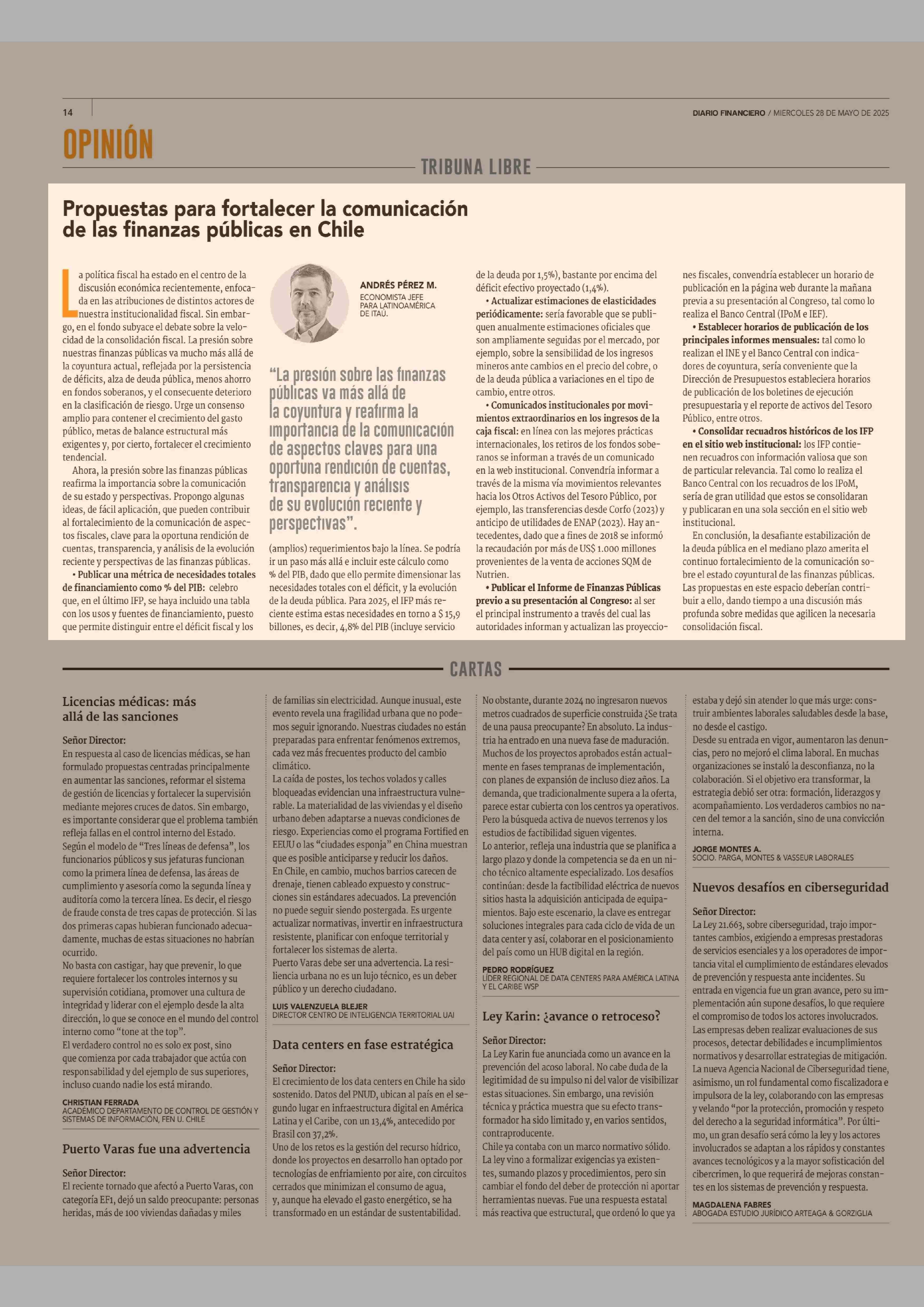COLUMNAS DE OPINIÓN: Propuestas para fortalecer la comunicación de las finanzas públicas en Chile 28-05-2025 Diario Financiero |