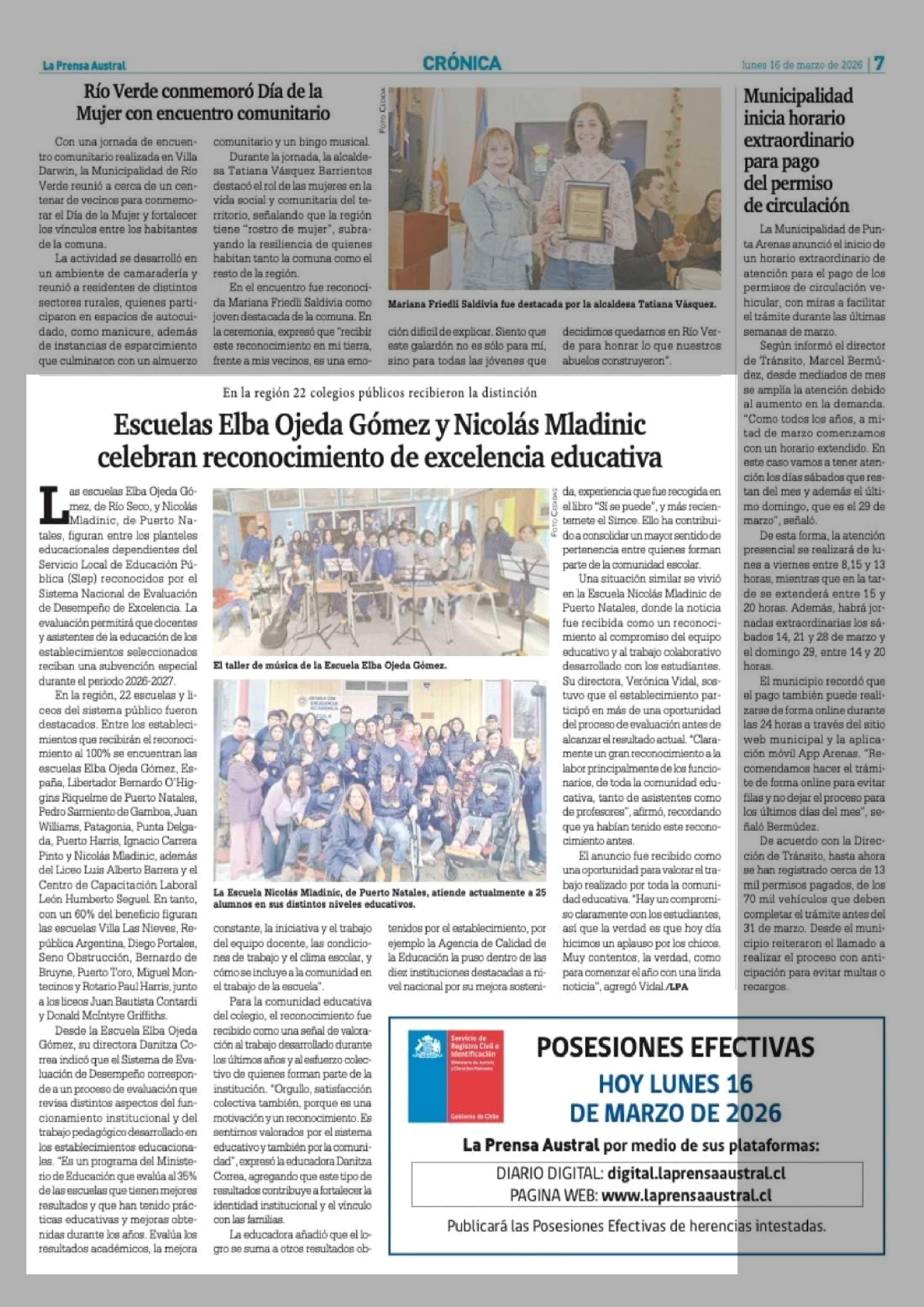 Escuelas Elba Ojeda Gómez y Nicolás Mladinic celebran reconocimiento de excelencia educativa 16-03-2026 La Prensa Austral |