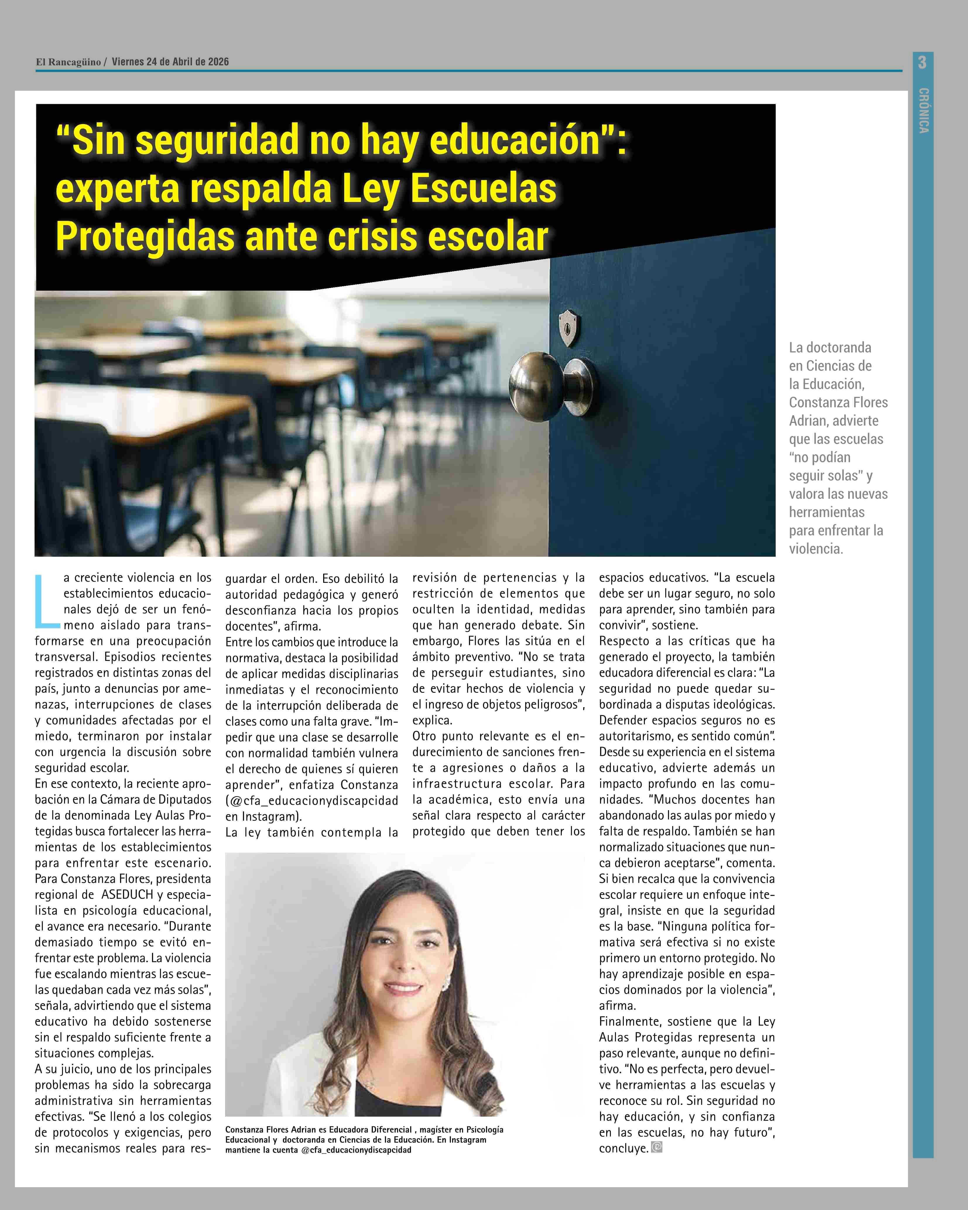 “Sin seguridad no hay educación": experta respalda Ley Escuelas Protegidas ante crisis escolar 24-04-2026 El Rancagüino |