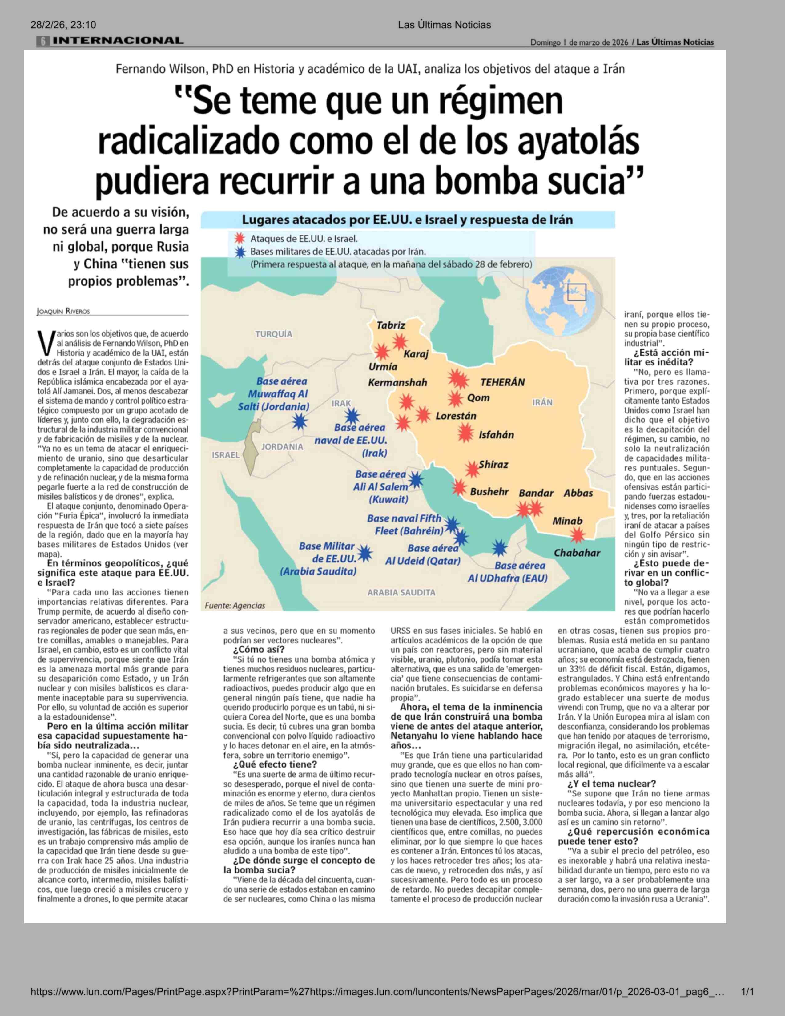 "Se teme que un régimen radicalizado como el de los ayatolás pudiera recurrir a una bomba sucia" 01-03-2026 Las Últimas Noticias |